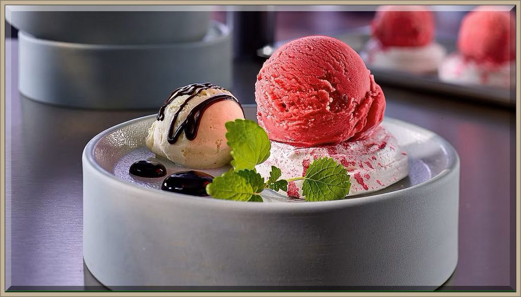 Als Nachtisch gab es noch ein Boubon-Vanilleeis mit Himbeer-Sorbet: