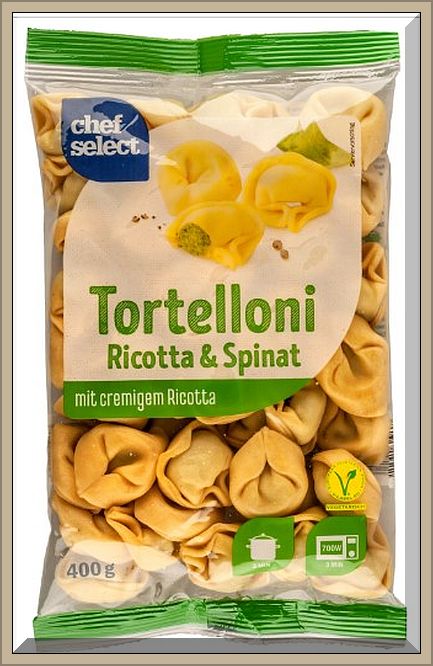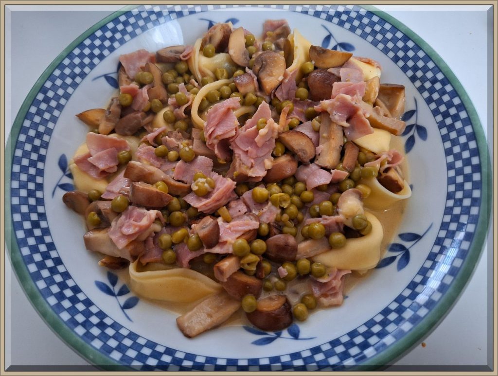 17 Uhr- Abendessen: Tortelloni und eine Sahnesoße mit scharf gebratenen u. gebutterten Champignons, Erbsen u. gek. Schinken, 100 ml Sahne, 200 ml instant Gemüsebrühe, Mondamin Soßenbinder, Pfeffer, Salz, Paprikapulver, 1 Prise Chili: