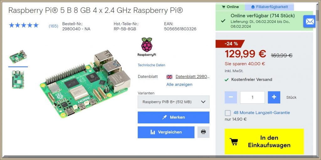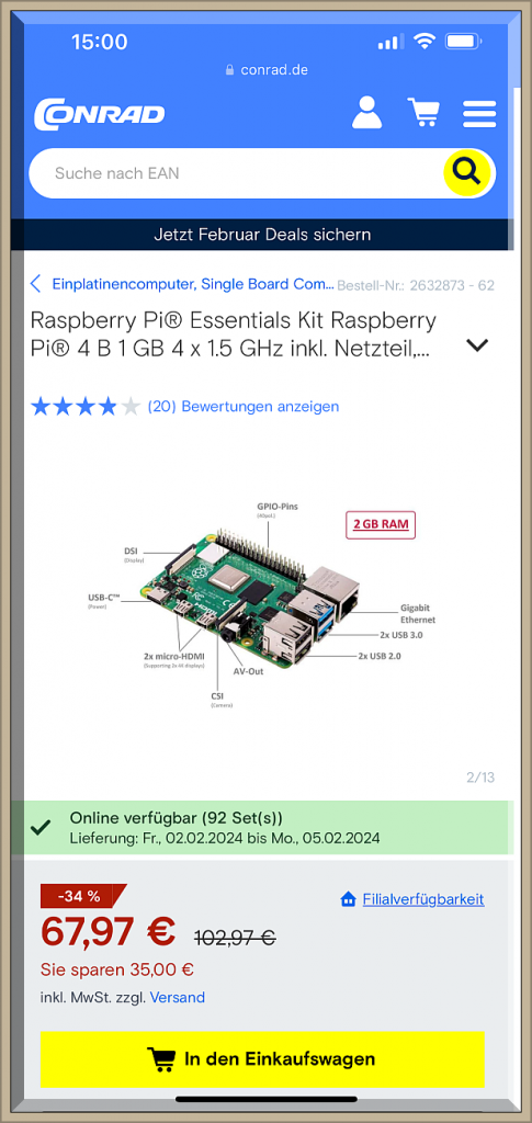 Da mir Delta Papa den Conrad LINK geschickt hatte, habe ich zum Raspberry PI bei CONRAD reingeschaut.