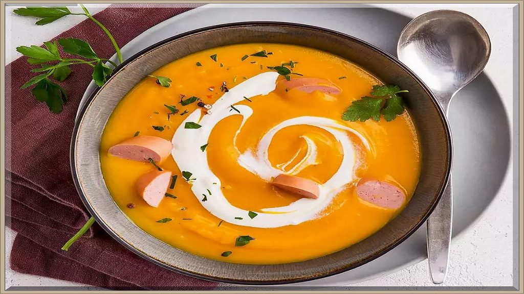 18 Uhr – Zum Abendessen gab es eine Kürbis/Karotten-Suppe mit Wiener- u. Krakauer-Würstchen: