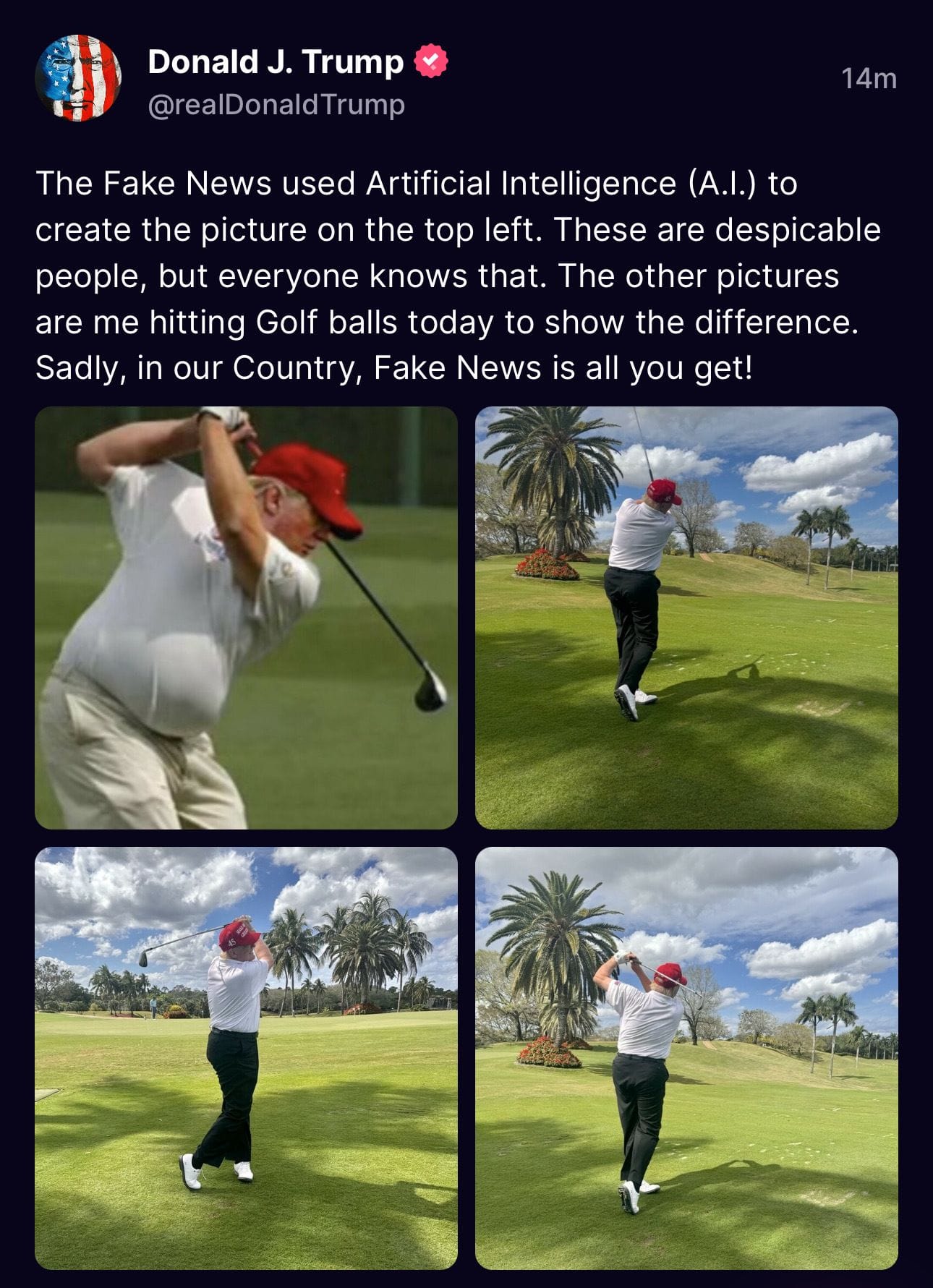 In dem Moment, indem der Richter in New York die Hammer-Strafe gegen Donald Trump wegen schwerem Finanzbetrug bekannt gab, verbreitete Donald Trump mehrere Fotos von sich. Sie zeigen ihn bei einer seiner Lieblingsbeschäftigungen, dem Golfen. So stellt sich der ehemalige US-Präsident am liebsten dar: grüner Rasen, blauer Himmel, Sonnenschein und Palmen, er mittendrin, wie er ein paar Bälle schlägt. Natürlich klagte er dabei gegen die Medien, die eh nur Lügen über ihn verbreiten würden.