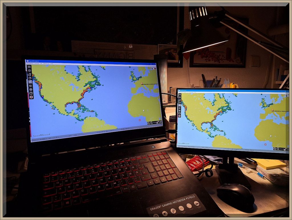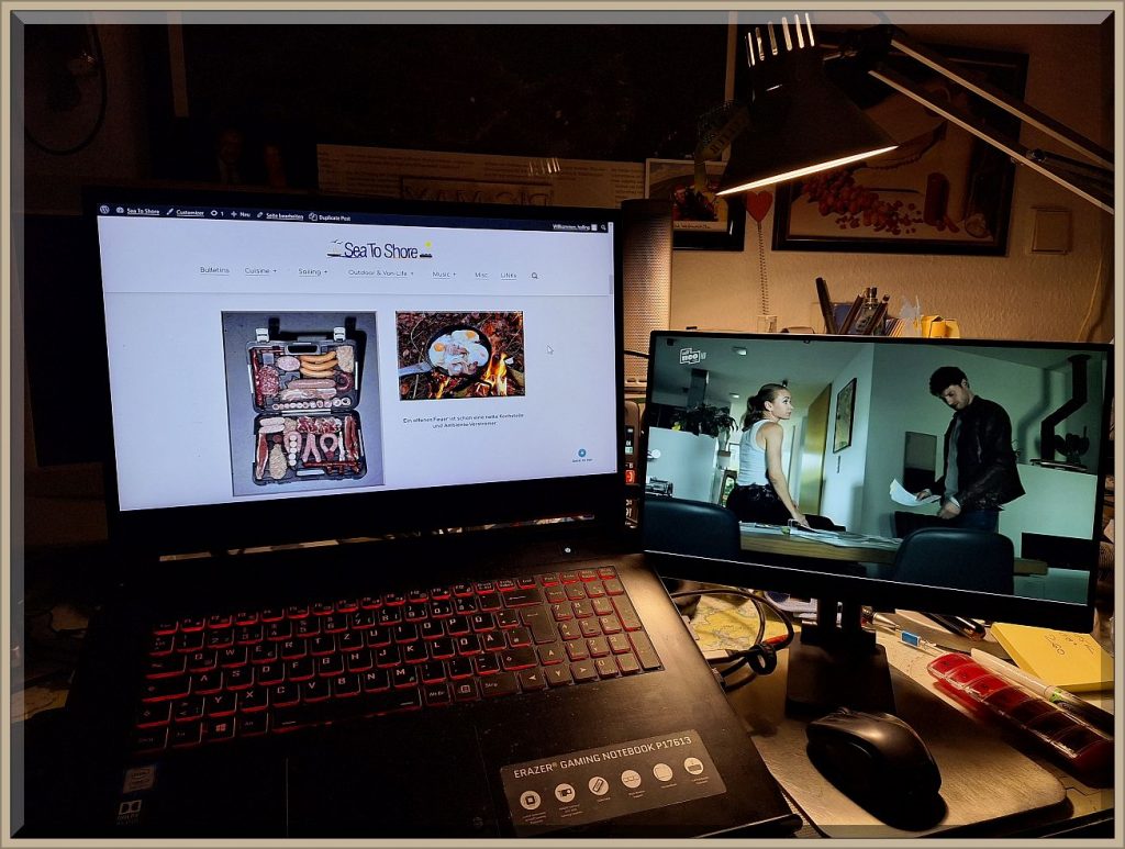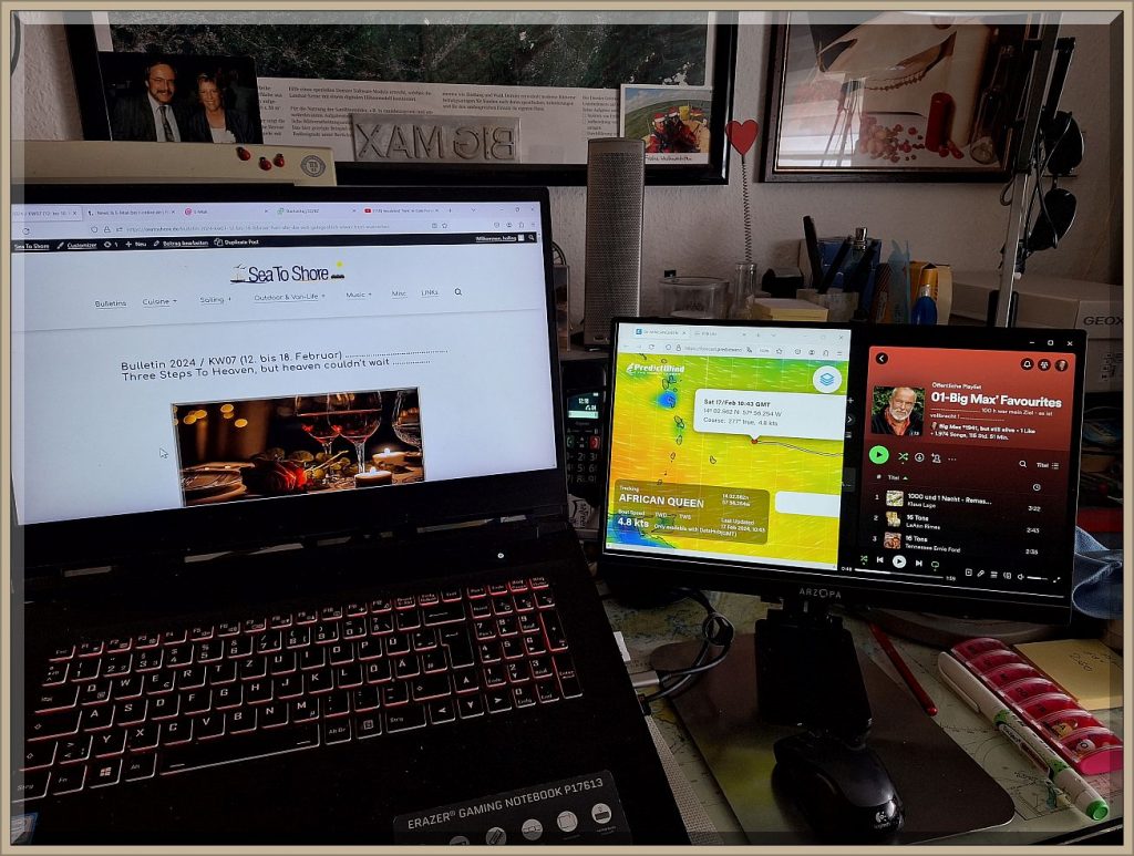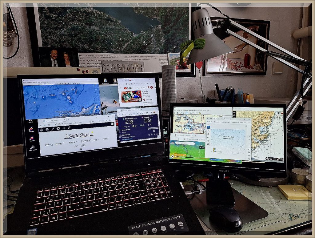 Diese Austattung hätte ich gerne bereits vor 25 Jahren an Bord haben mögen. Ich hatte das damals auf einem (!) 14″ Notebook realisiert, was schnell unübersichtlich wurde. Heute auf obigem Bild hat das Notebook einen 17.3″ Bildschirm und der rechte portable Monitor einen von 15.6″ – einfach breathtaking.