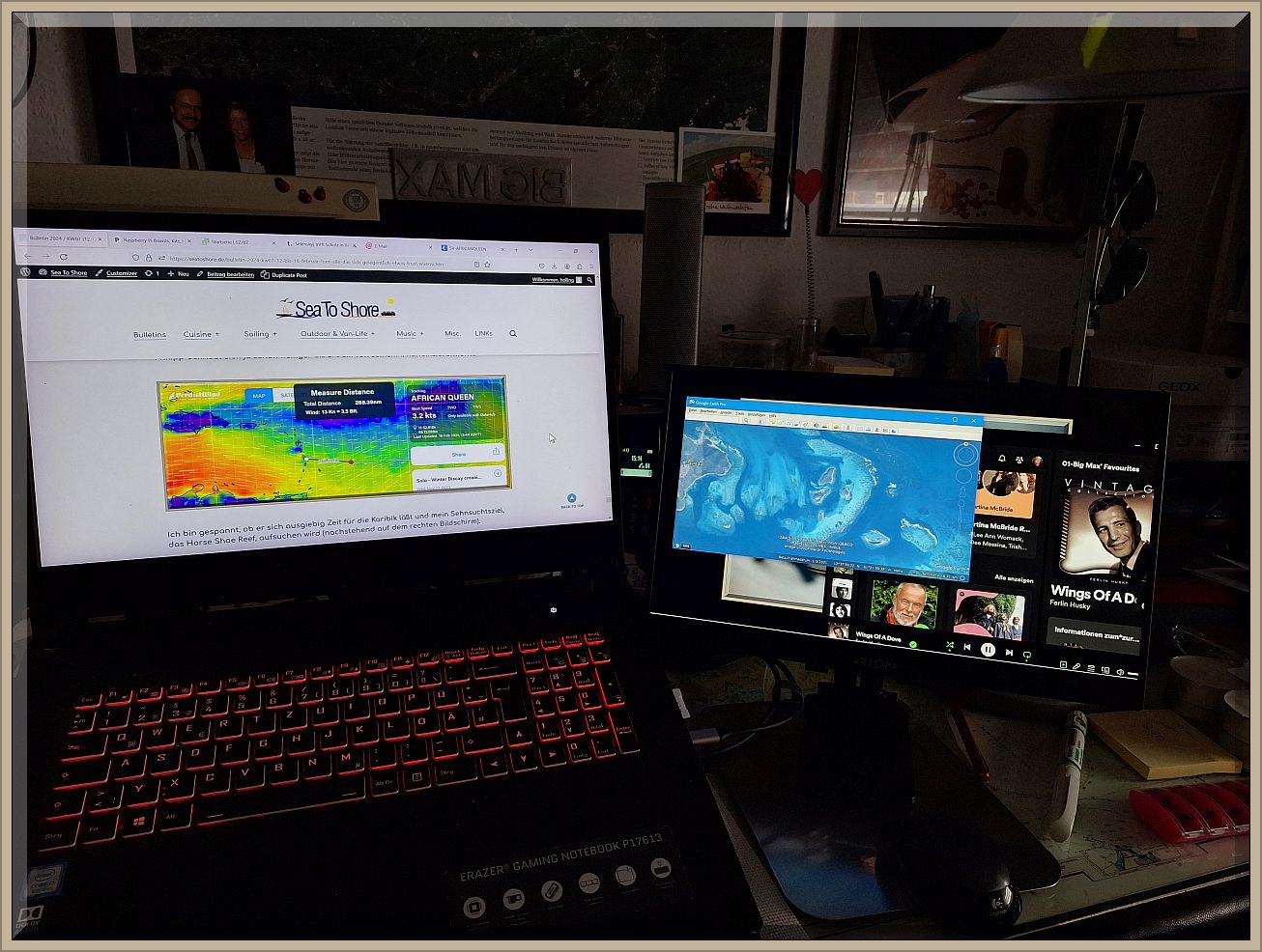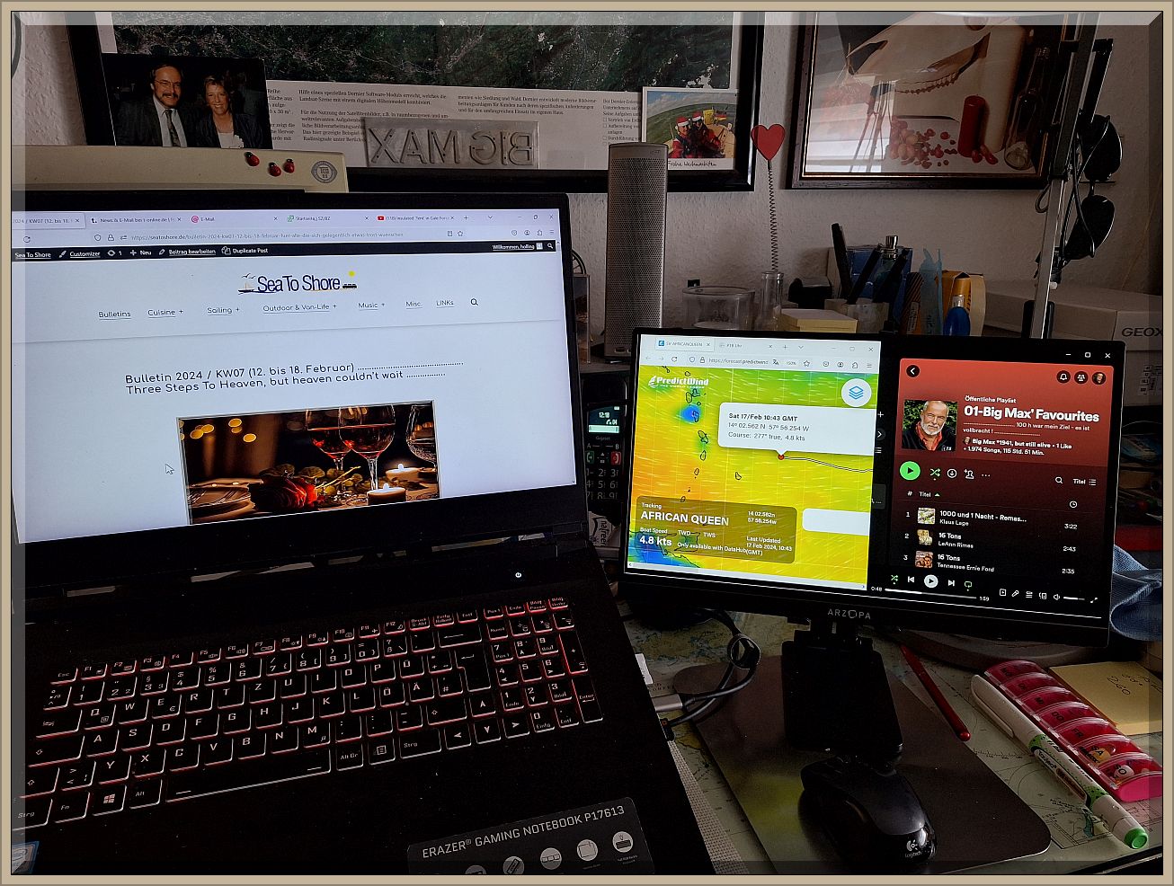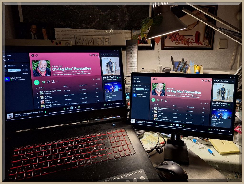 Diese Austattung hätte ich gerne bereits vor 25 Jahren an Bord haben mögen. Ich hatte das damals auf einem (!) 14″ Notebook realisiert, was schnell unübersichtlich wurde. Heute auf obigem Bild hat das Notebook einen 17.3″ Bildschirm und der rechte portable Monitor einen von 15.6″ – einfach breathtaking.