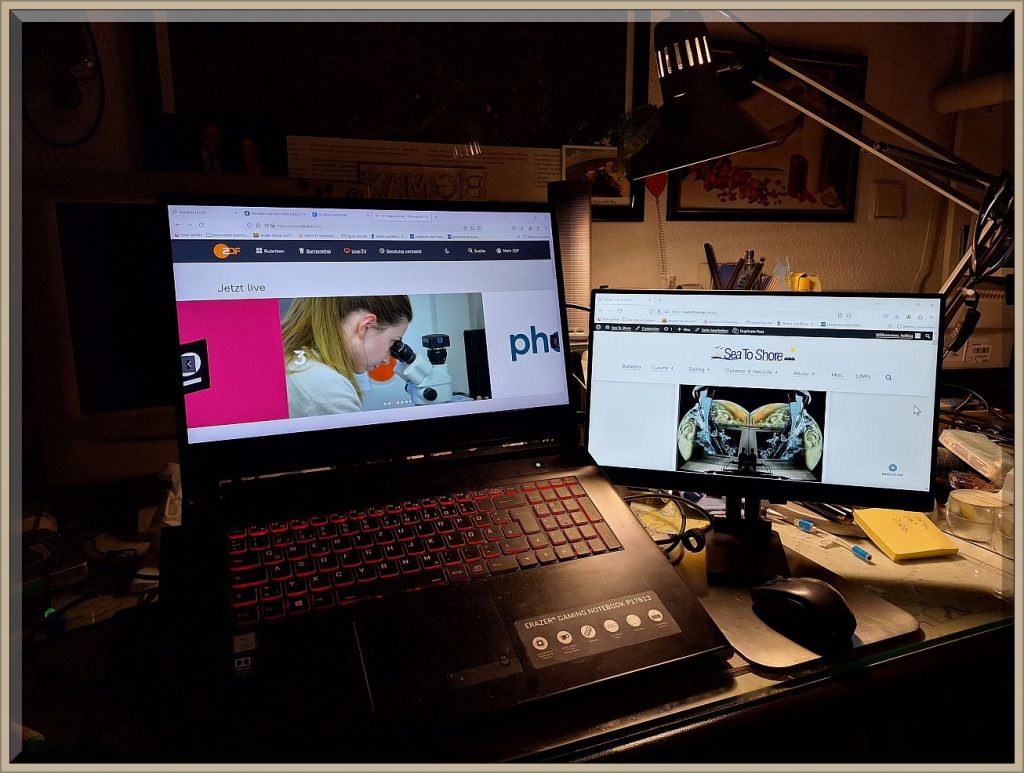 Es hat etwas gedauert bis ich mein Laptopscreen darauf spiegeln konnte (oben). Nun muss ich noch herausfinden, wie ich auf beiden Bildschirmen einen anderen Inhalt darstellen kann. Auch das werde ich mit Versuch und Irrtum herausbekommen. Noch zu Windows 95 konnte ich das schon, alles in der Versenkung verschüttet. Das muss ich gleich wieder freischaufeln! Nach 5 Minuten war es gelungen (nachstehend).