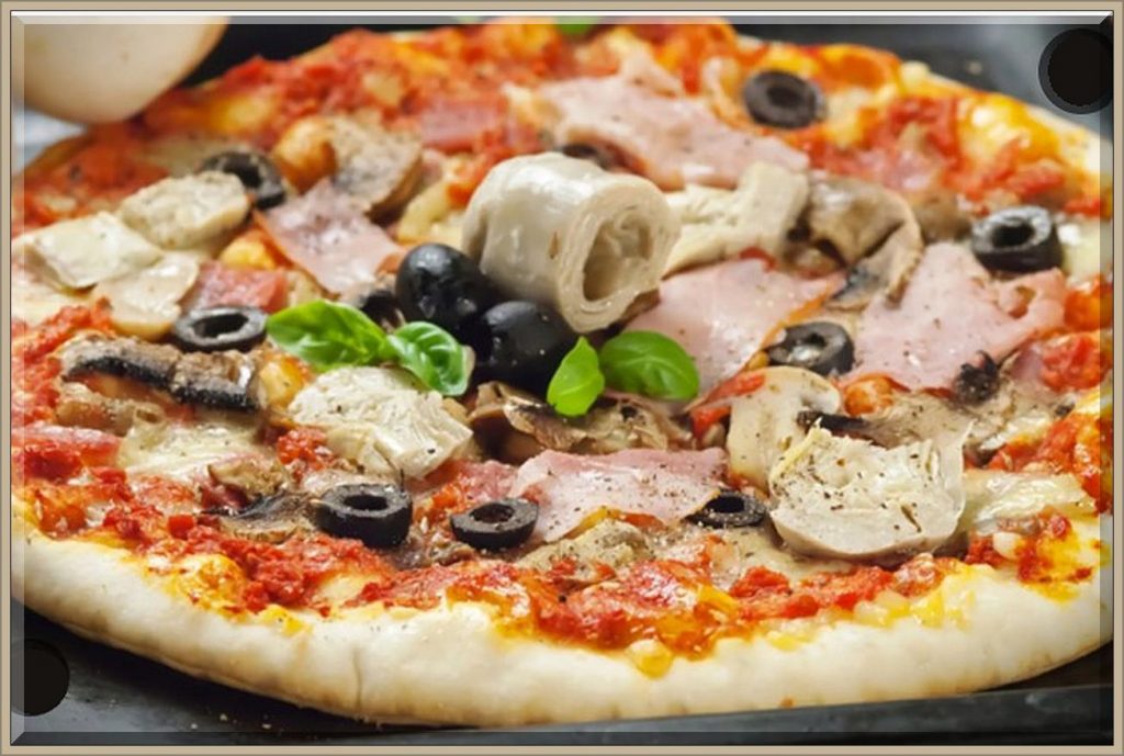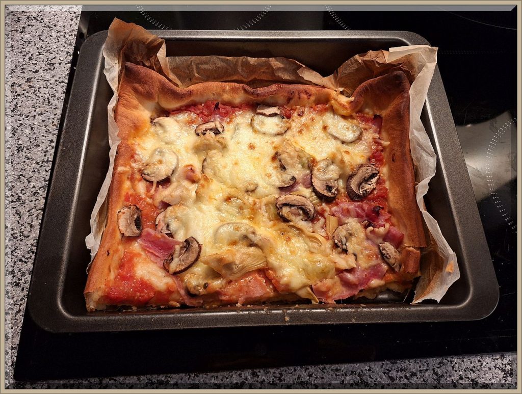 Zutaten: Pizzateig (gekauft), Tomatensoße selber aus 5 frischen geschälten Tomaten zubereitet mit Oregano, Pfeffer u. Salz gewüzt und stark reduziert, zarter ital. Kochschinken (Prosciutto Cotto), Champignonscheiben, Artischockenherzen (Konserve), Mozzarellakäse, wenig Gratinkäse darüber. Auf Oliven haben wir verzichtet, da wir vergessen hatten, welche zu kaufen. 20 Minuten in den auf 200 °C vorgeheizten Ofen.