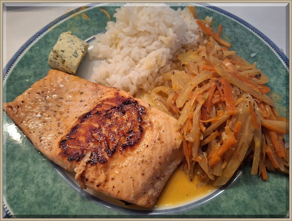 17:30 Uhr – Abendessen: Lachsforellenfilet (ALDI) 4 Minuten scharf auf der Hautseite anbraten und anschließend wenden und 3 Minuten bei halber Hitze durchgaren. Das Fenchel-/Möhren- Gemüse im Julienneschnitt- erst 10 Minuten in etwas Öl in einer Wokpfanne scharf anbraten ohne zu verbrennen und häufig wenden dann mit 150 ml Instant Gemüsebrühe ablöschen und weitere 10 Minuten abgedeckt köcheln lassen, dann mit Sahne, Peffer u. Salz, Saft einer halben Zitrone abschmecken.