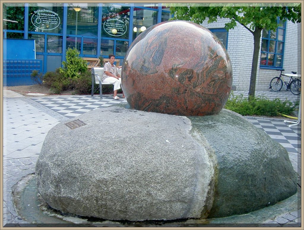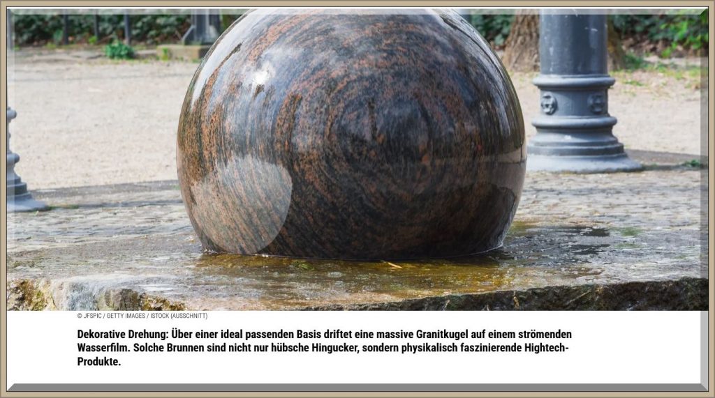 Bei Kugelbrunnen rotiert ein mitunter tonnenschwerer Stein reibungsarm auf einem dünnen Wasserfilm. Das funktioniert physikalisch nur, wenn die Kugel und ihre Basis hochpräzise aufeinanderpassen. Dann braucht es für diesen Balanceakt erstaunlich wenig Druck.