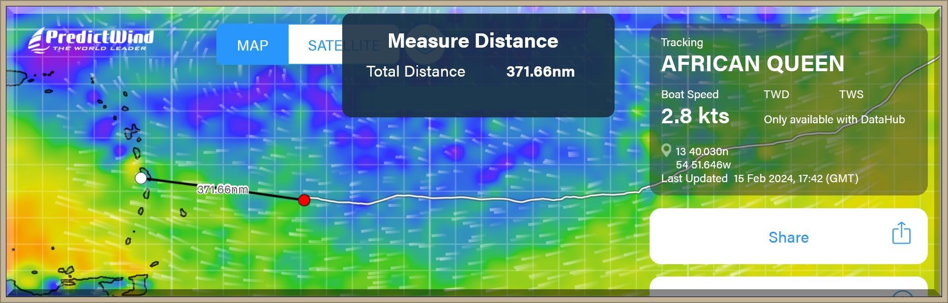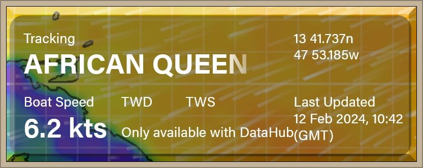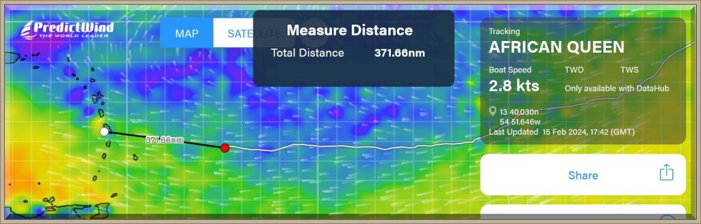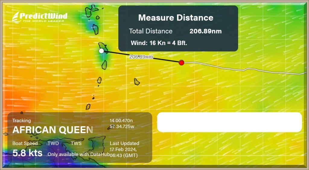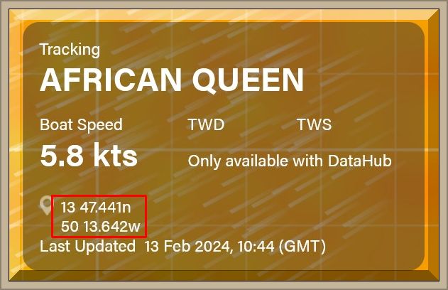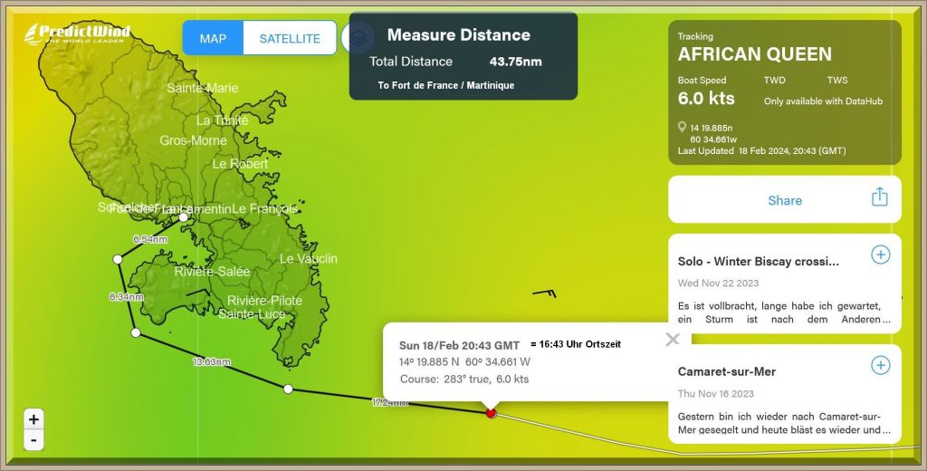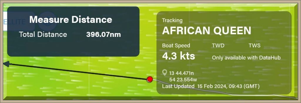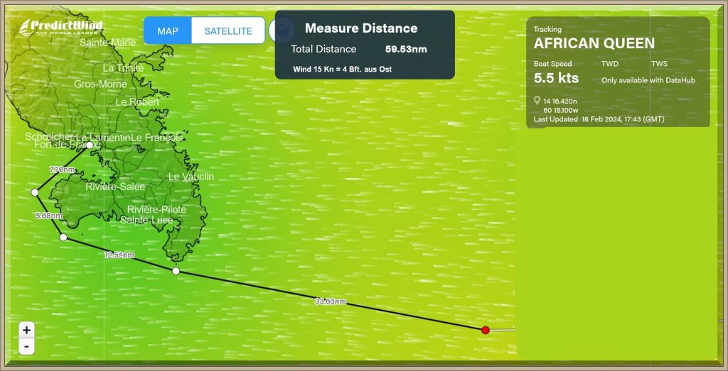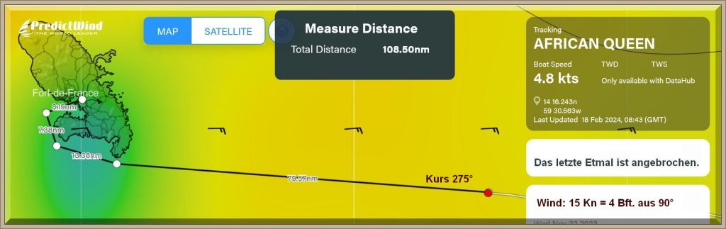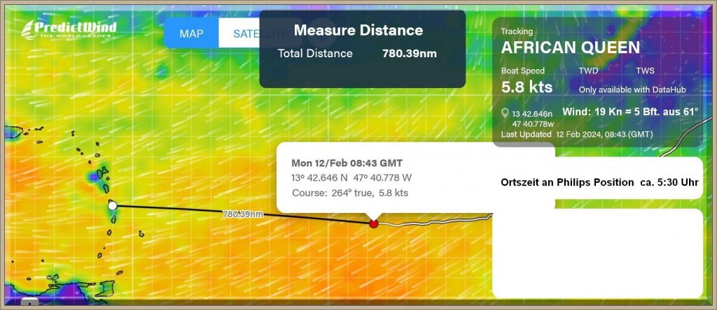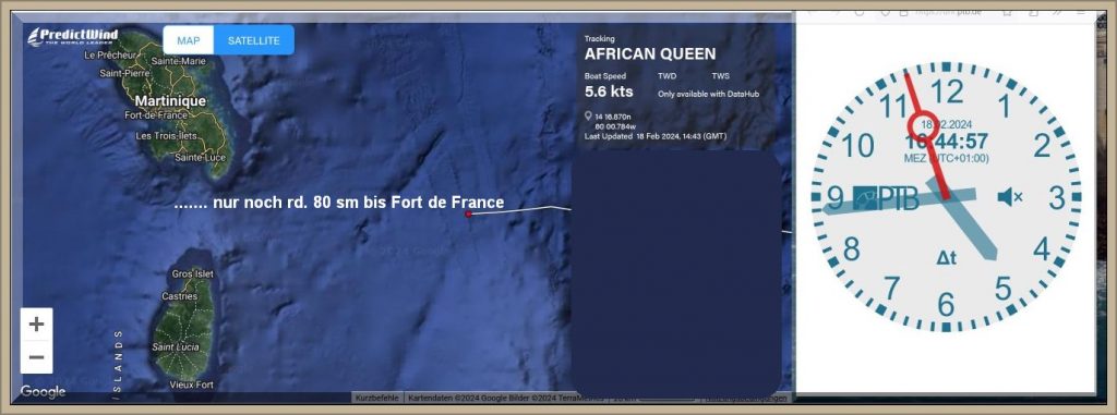 Um 18:43 Uhr MEZ liegen nur noch 60 Seemeilen vor dem Bug der African Queen: