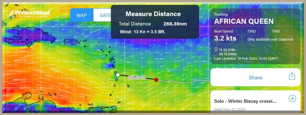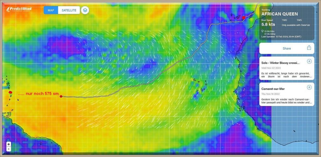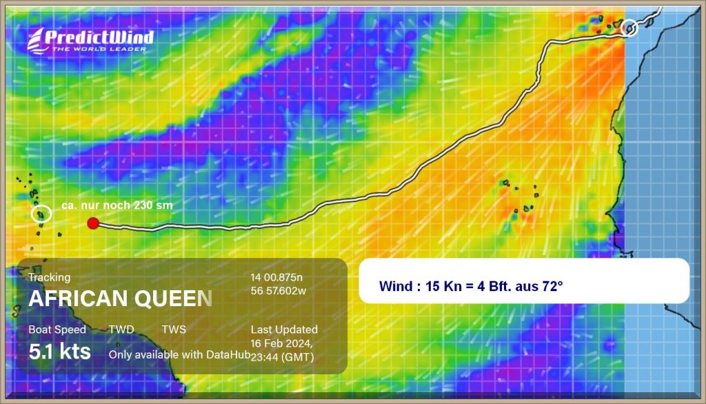 Wenn die Windverhältnisse so anhalten, wird er wohl eine der angenehmsten Atlantiküberquerungen realisiert haben, wenn man einmal von den üblichen Schlafdefiziten absieht.