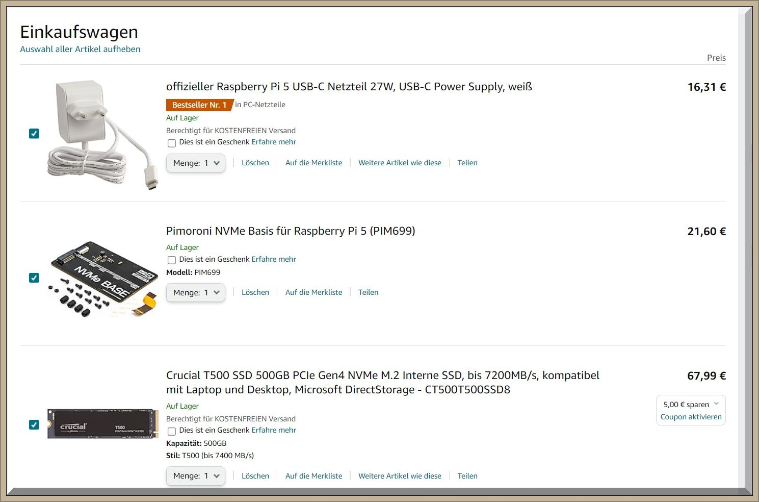 Ich habe mich für den Raspberry Pi 5 entschieden. Jetzt muss ich nur noch eine Bezugsquelle entdecken, die ihn und die erforderlicheen Komponenten auch vorrätig hat: