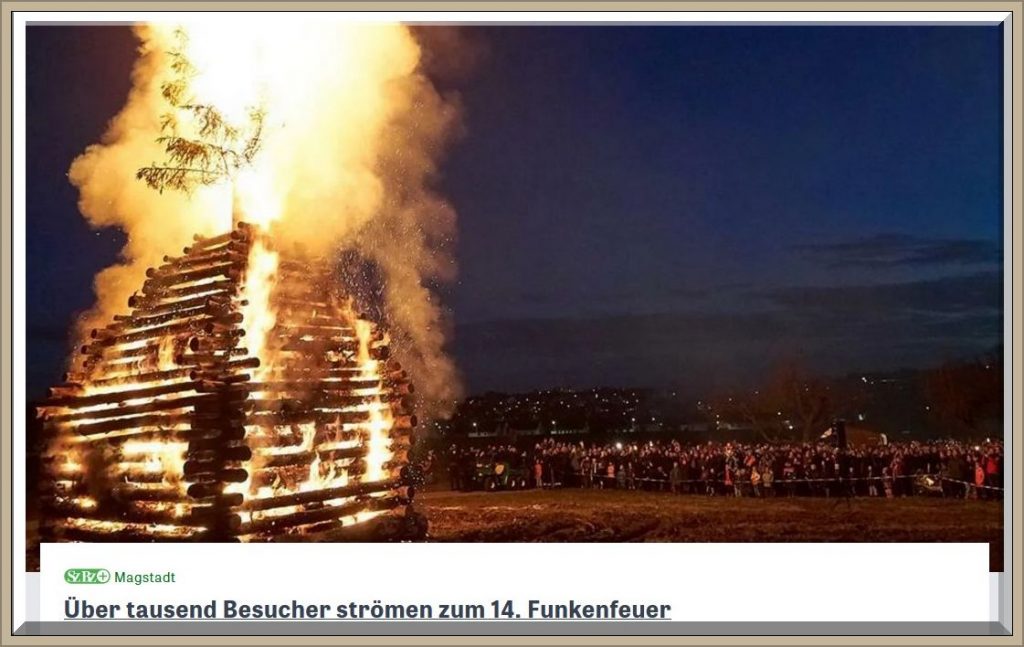 Am ersten Samstag nach Aschermittwoch lockt die Freiwillige Feuerwehr Magstadt mit Festzelt, Fackelzug und einem gewaltigen Funkenfeuer an den Ortsrand. Dem Funkenfeuer-Ruf folgen auch diesmal wieder weit über tausend Besucher. Und die ganz Erfahrenen machen zur 14. Funkenfeuerausgabe dabei eine ganz neue Erfahrung. Denn den Fackelzug vom Feuerwehrhaus am Friedhof vorbei hinauf zur Steegmüllerwiese ……………