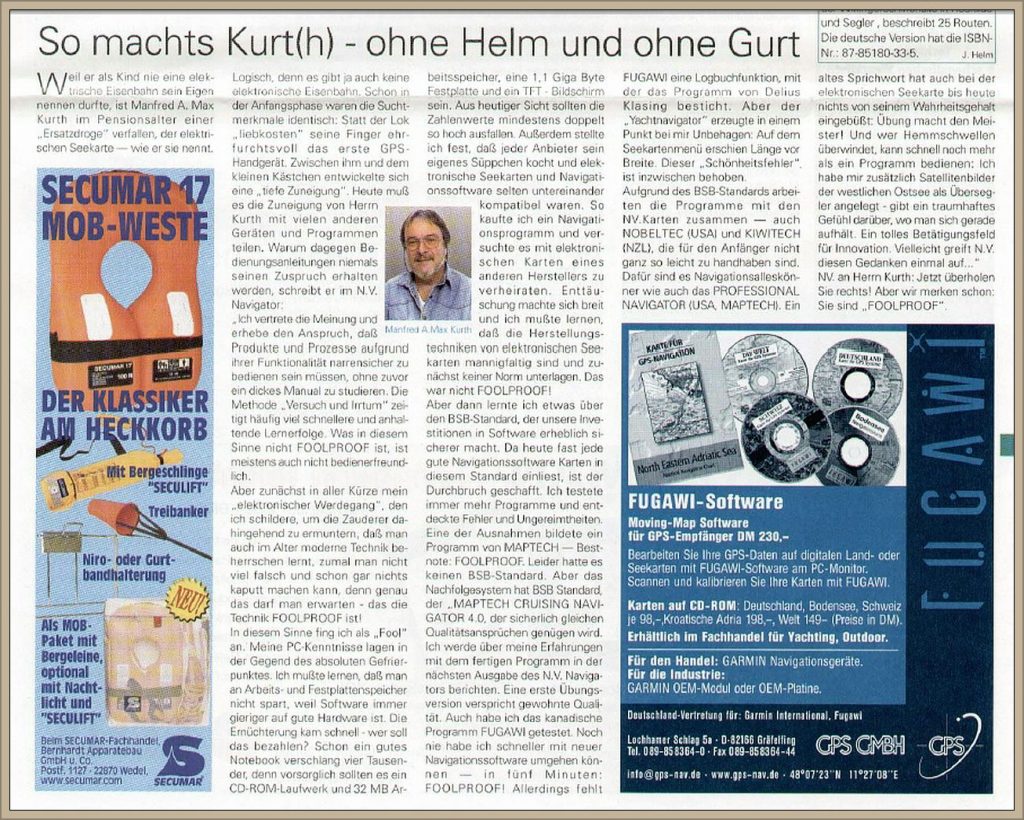 Natürlich würde ich das stoßempfindliche HDD Notebook heute durch einen kleinen ruggadized (stoßsicheren) Raspberry Pi5 mit SSD-Speicher ersetzen und 2 portabe Flachbildschirme anschließen. Allerdings betone ich immer wieder gerne, dass mich mein Equipment und auch die Software in 25 Jahren der elektronischen Navigation nie in Stich gelassen haben. Was denke ich gerne an diese Zeiten zurück!