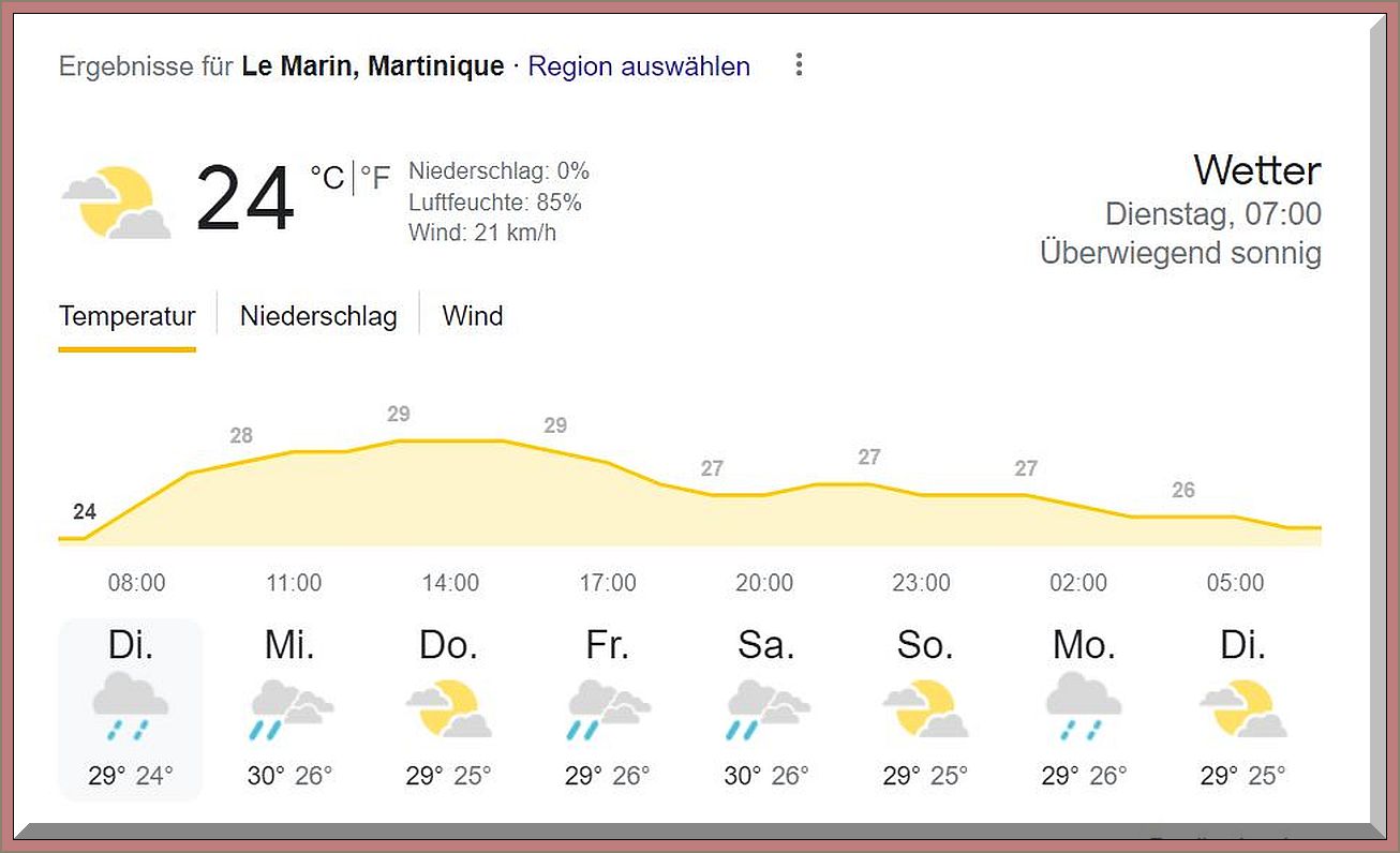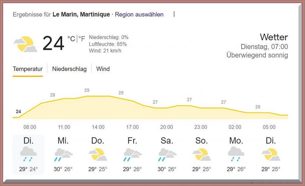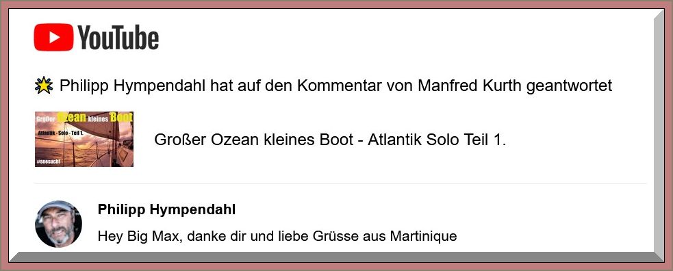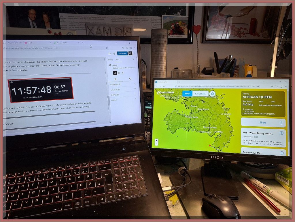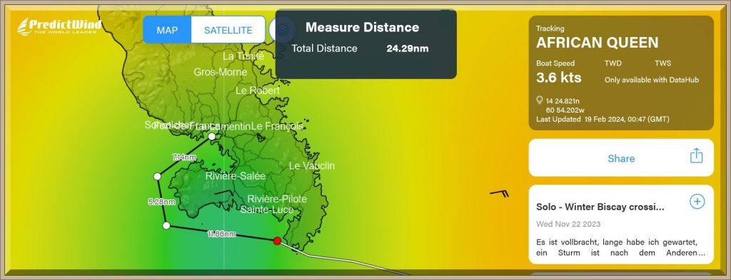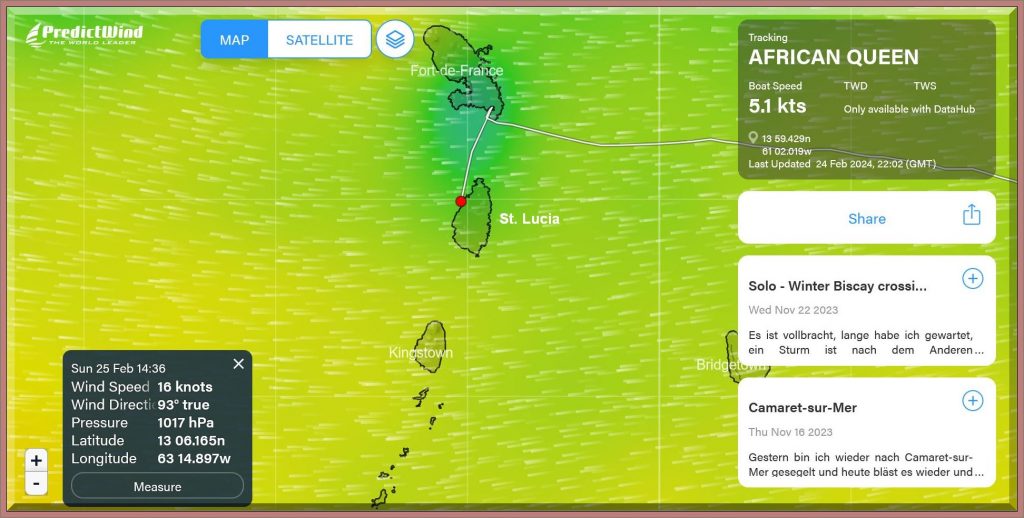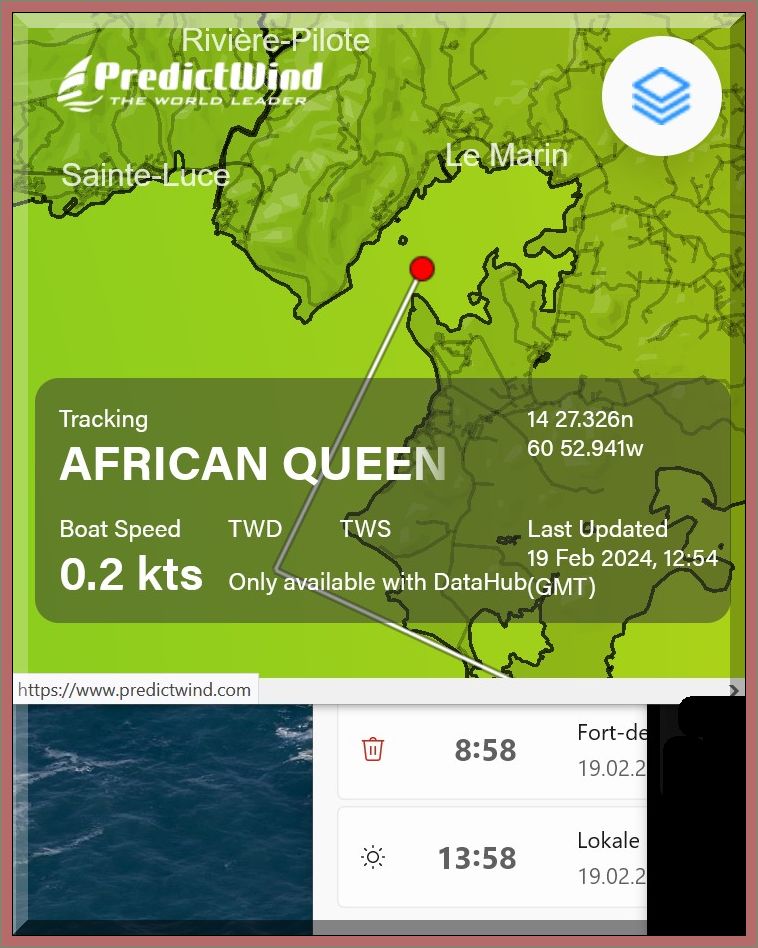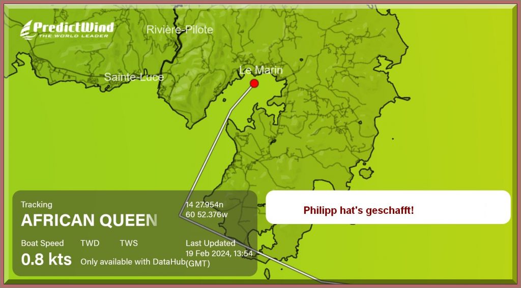 Philipp sendet schon seit 10 h kein PredictWind-Signal mehr von Martinique, sodass ich nichts Aktuelles von im berichten kann. Ich werde es auf meinem 2. Bildschirm beobachten, wenn er sich wieder bewegt.