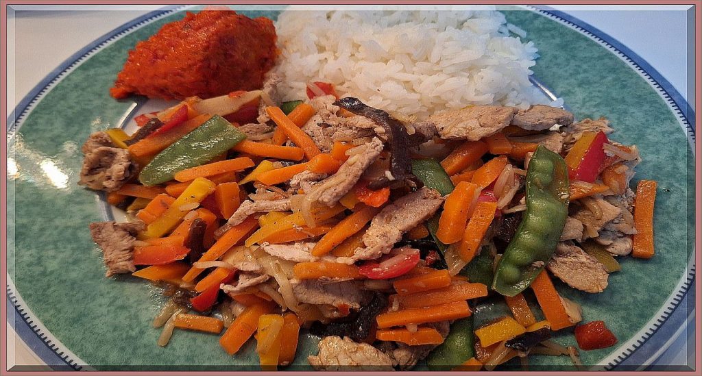 17:15 Uhr – Abendessen: Asia Wok Gemüse mit fein geschnetzeltem Schweinfilet, Jasminreis und für mich ein Klecks Ajvar: