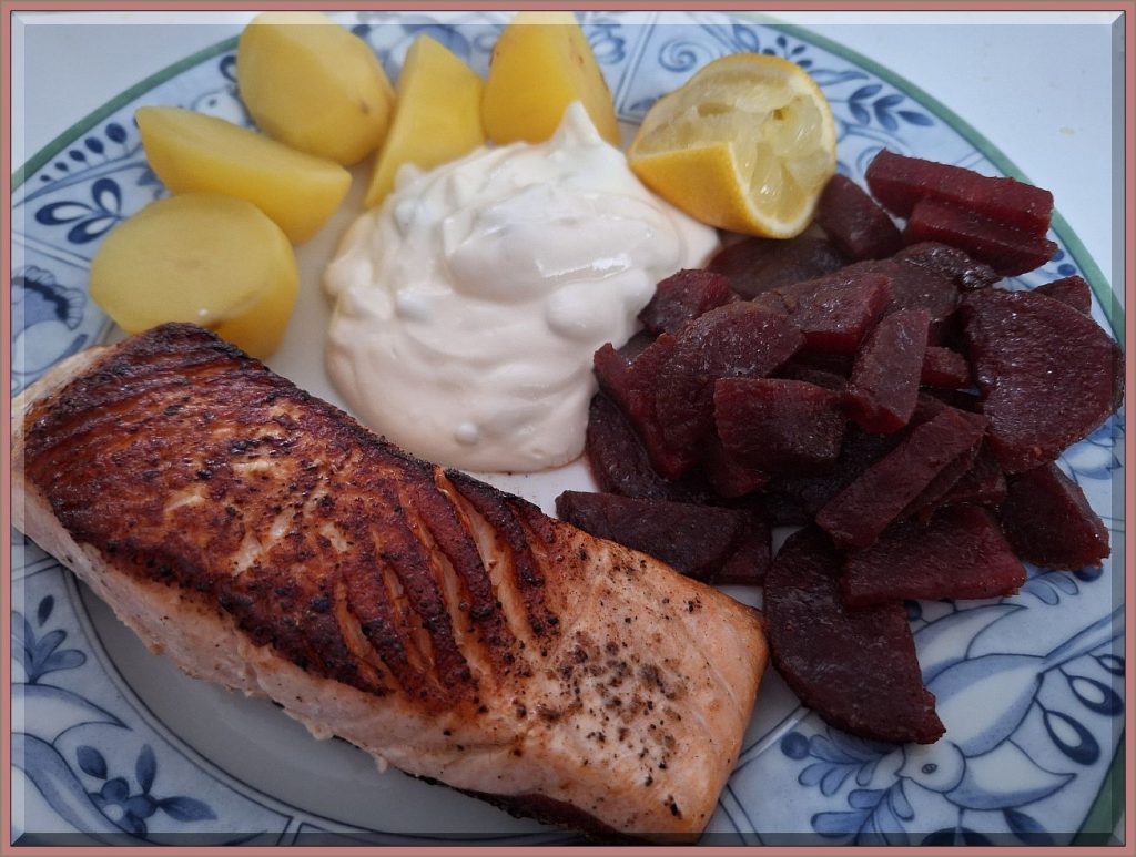 17:15 Uhr – Unterbrechung zum Abendessen: Lachsschnitte, Rote Bete mit einem Schuß Balsamico, einem Lauchzwiebeldip und Salzkartoffeln: