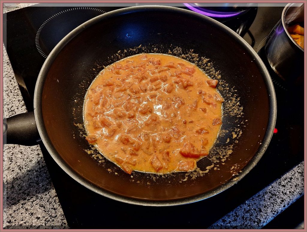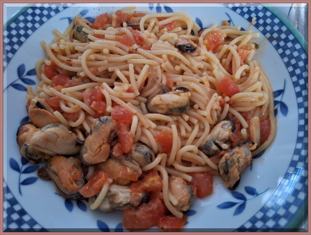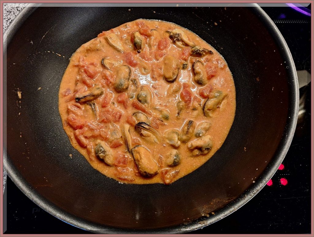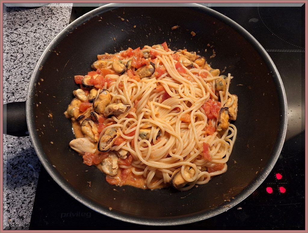 17:15 Uhr – Abendessen: Muscheln in Tomatensoße mit Knoblauch, 2 EL saure Sahne, Salz, Pfeffer, Chili und Spaghetti: