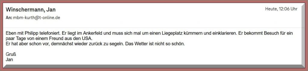 Ein elektronisches Lebenszeichen von Philips Ankerplatz (?) um 8:58 Uhr Ortszeit Karibik: