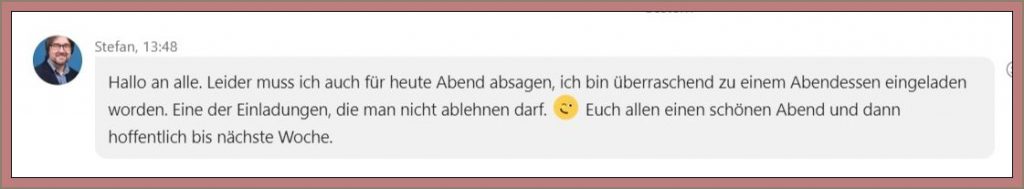 13:55 Uhr – Gleich wird sich meine Tochter bei mir melden, um die Logistik für den heutigen Spaziergang abzutimmen.