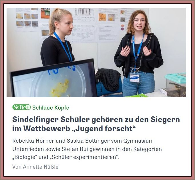 Nach zwei spannenden Tagen stehen die Sieger des diesjährigen Regionalwettbewerbs „Jugend forscht“ fest. Mit dabei sind auch zwei Beiträge aus Sindelfingen. Im Bereich „Biologie“ beschäftigten sich Rebekka Hörner und Saskia Böttinger vom Gymnasium Unterrieden mit der Frage wie Schleimpilze auf unterschiedliche Reize reagieren und in der Kategorie „Schüler experimentieren“ wurde Stefan Bui für seine Arbeit für ein kostengünstiges Anti-Beschlagmittel für Brillen ausgezeichnet.