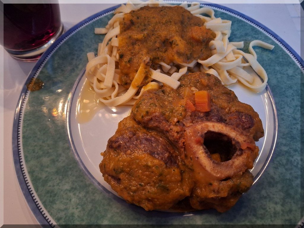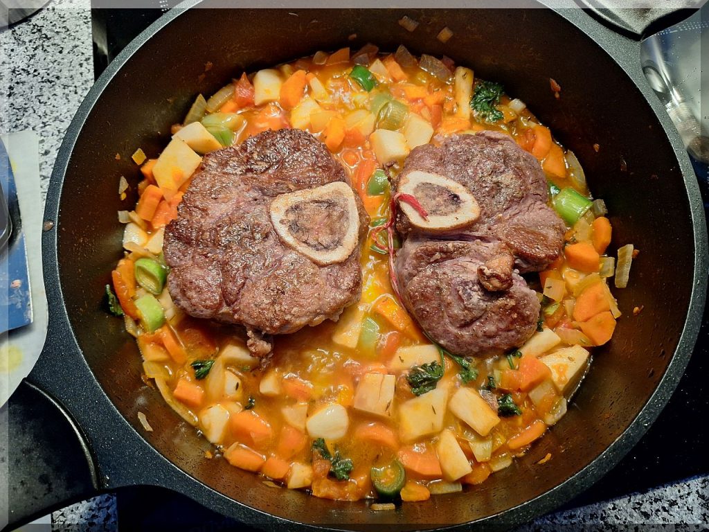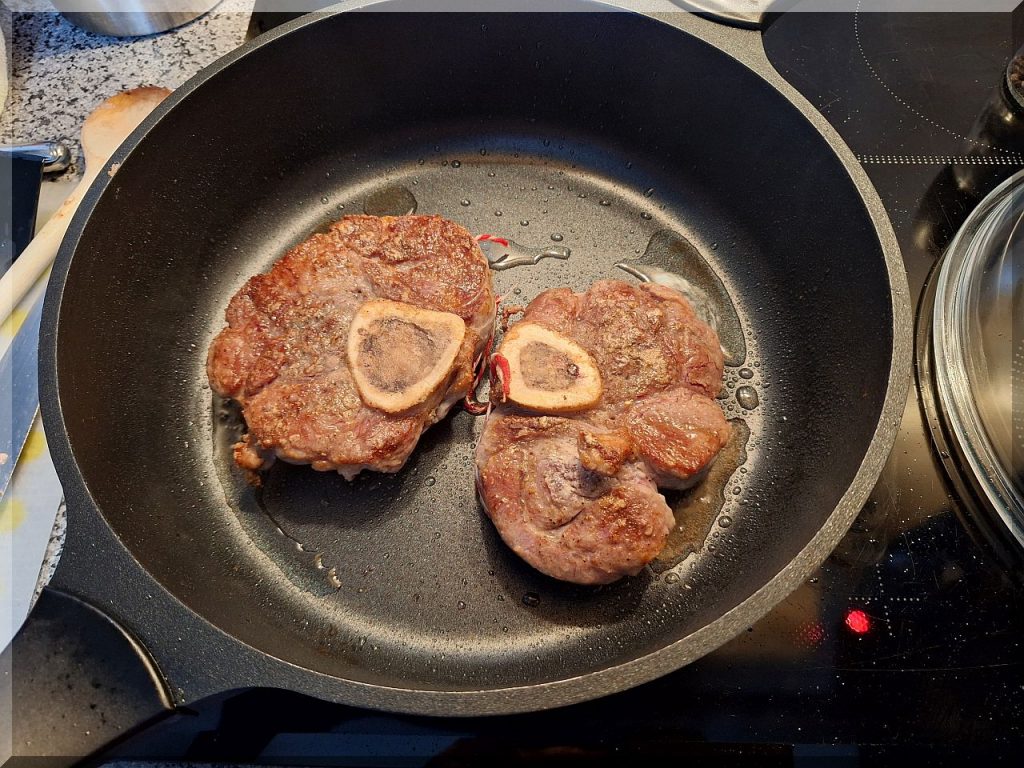 Soeben haben wir unser Abendessen vorbereitet: Ossobuco mit Gemüse und Pasta: