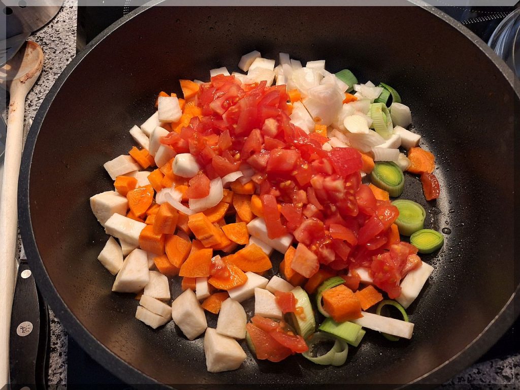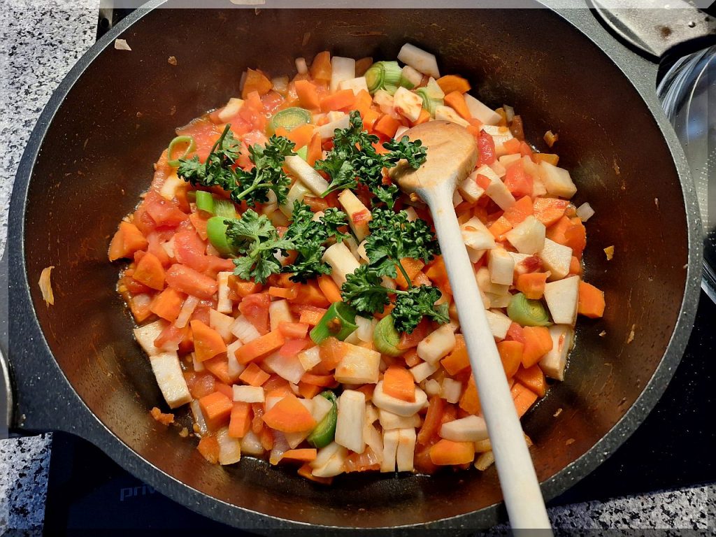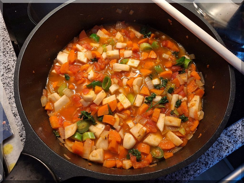 Nun muss alles noch zugedeckt 2 Stunden auf kleiner Flamme schmoren!