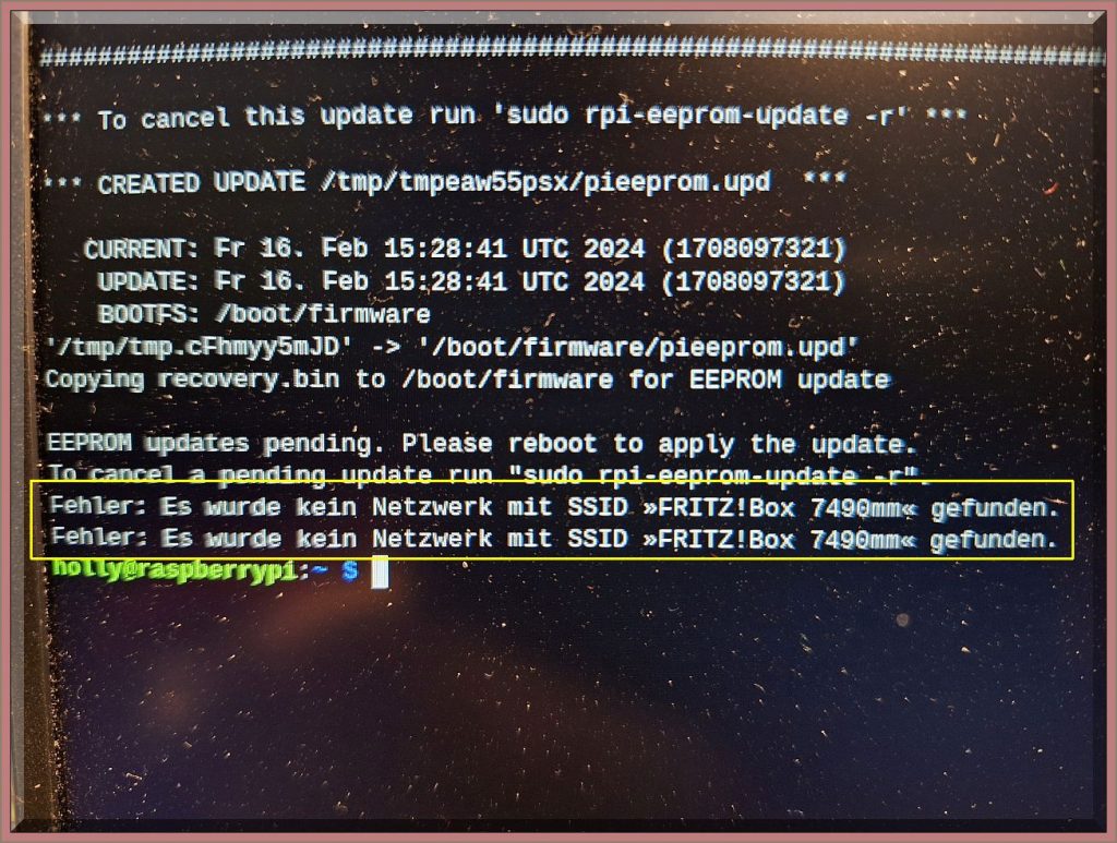 Nun haben sich Marianne und ich zusammengesetzt, um meinen Raspberry Pi 5 mit unserem häuslichen WLAN-Netz zu verbinden, doch scheitern wir auch im Team. Ich befrage Youtube und bekomme 5 Anweisungen und dabei wird mir klar, dass es nicht so einfach geht, wie wir uns das gedacht hatten. Man muss etlich Eingaben in den ‚Eingeweiden‘ von LINUX vornehmen. Für einen LINUX-Anfänger nicht so leicht, aber sicherlich machbar. Ich schätze, dass ich etwas 10 Eingaben in LINUS-Syntax vornehmen muss, ehe es funktionieren wird.