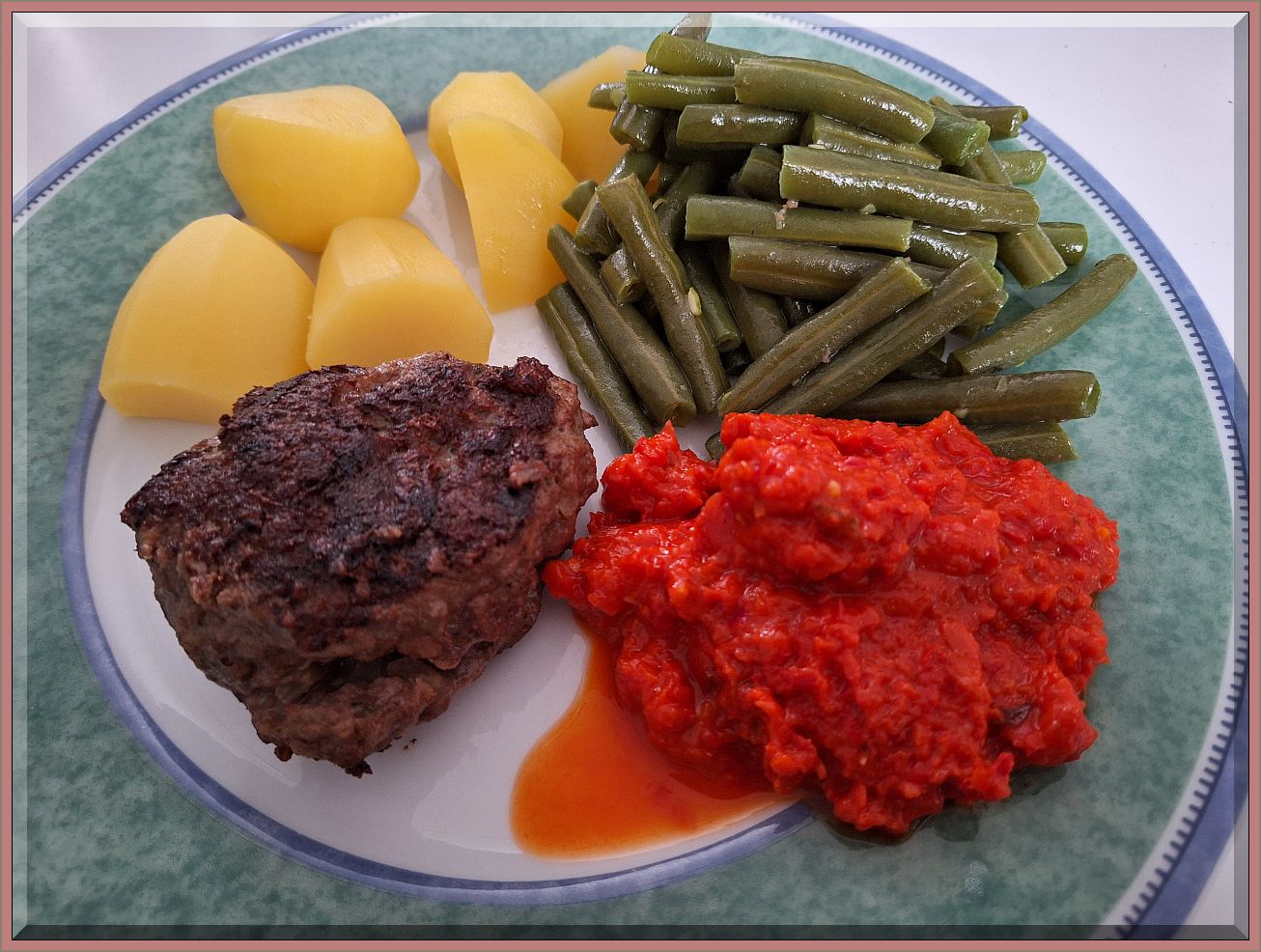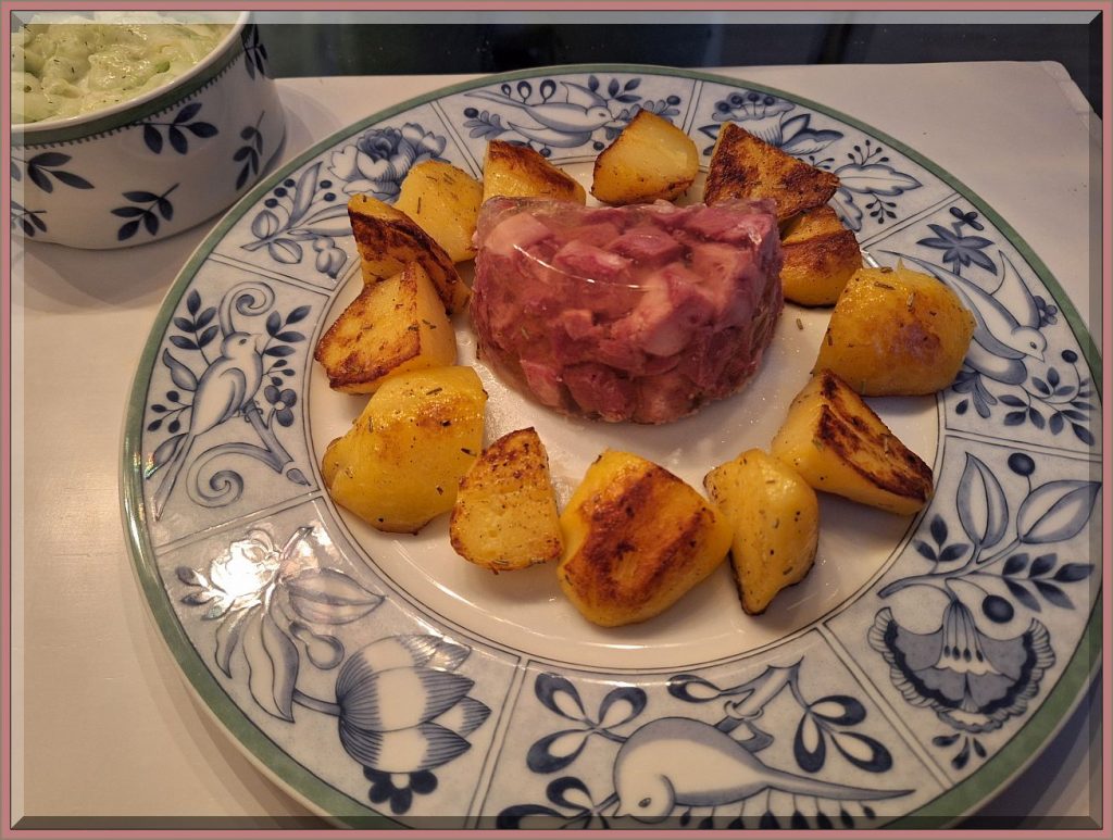 18 Uhr – Es gibt ein einfaches Abendessen: Sauerfleisch von Dreistern mit Rosmarinkartoffeln und einem Gurkensalat: