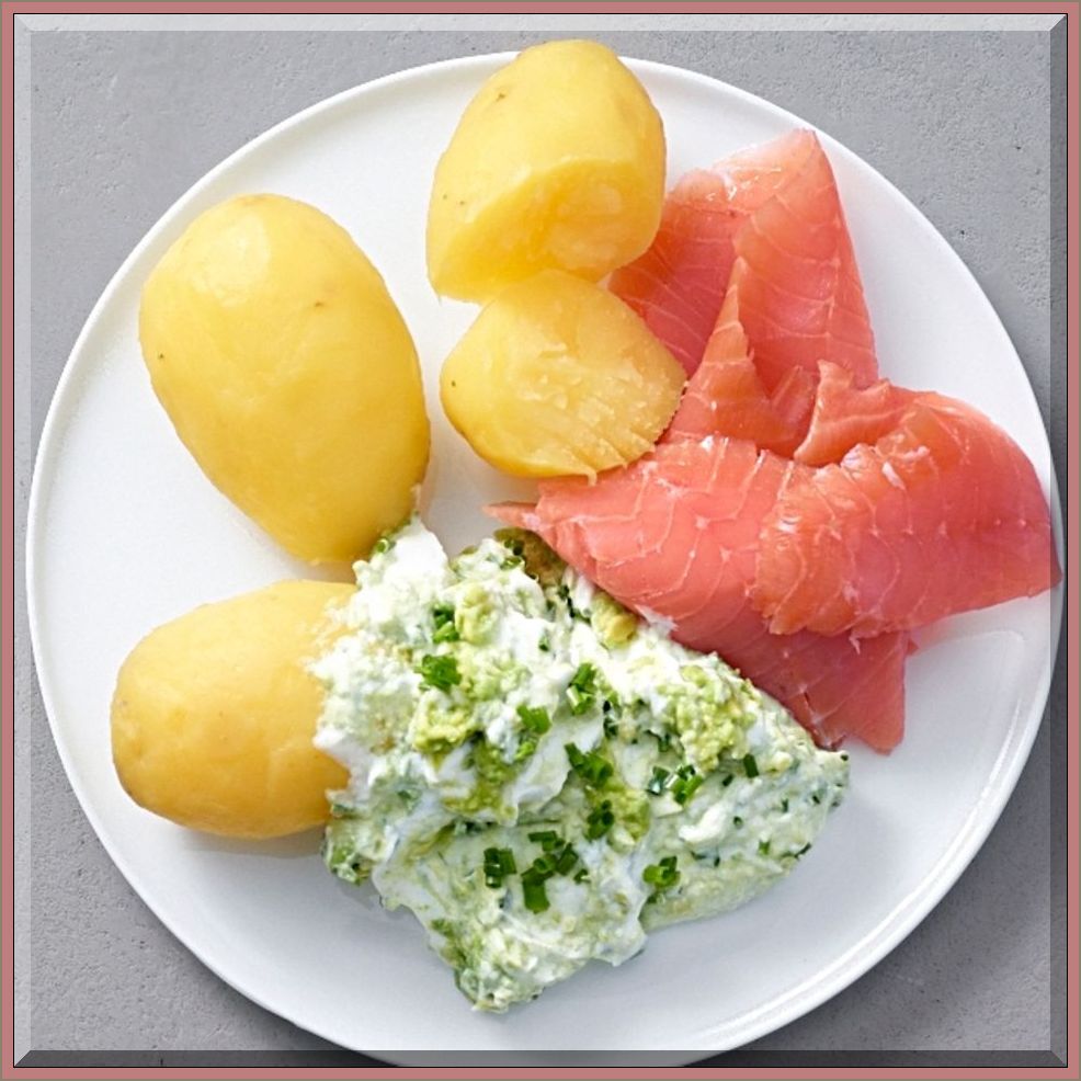 17:30 Uhr – Zum Abendessen gibt es Quark mit Pellkartoffeln und Lachs. Den Quark gibt es wahlweise mit Avocado oder Ajvar: