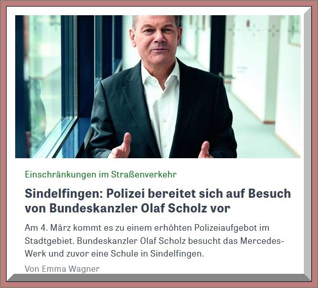 Am Montag besucht Bundeskanzler Olaf Scholz (SPD) das Mercedes-Werk in Sindelfingen, um sich die Factory 56 zeigen zu lassen. Danach ist er im Gespräch mit Ola Källenius, Vorstandsvorsitzender der Mercedes-Benz Group AG, und dem Betriebsratsvorsitzenden Ergun Lümali. Davor besucht er noch die Gottlieb-Daimler-Schule1 in Sindelfingen.