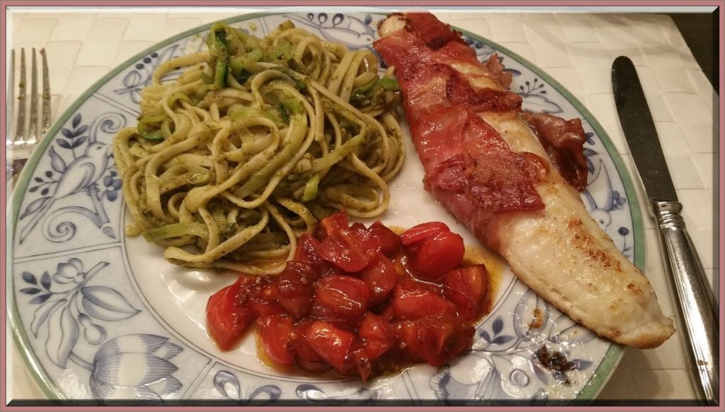 17 Uhr – Heute gab es wieder ein lukullisches Abendessen: Zanderfilet im Parmaschinken-Mantel mit Balsamico Kirschtomaten und Linguine mit Julienne-Zucchino.