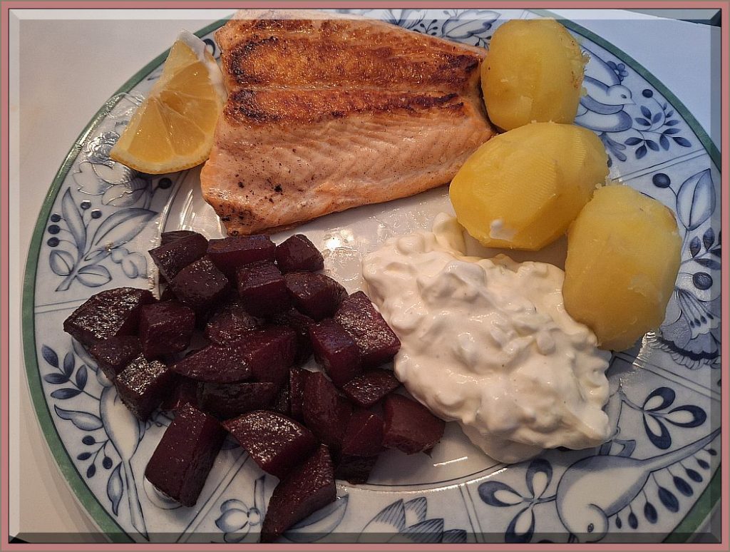 Lachsfilet, gewürfelte Rote Bete in Butter gewärmt mit Balsamico, Pellkartoffeln mit Lauchzwiebel-Dip: