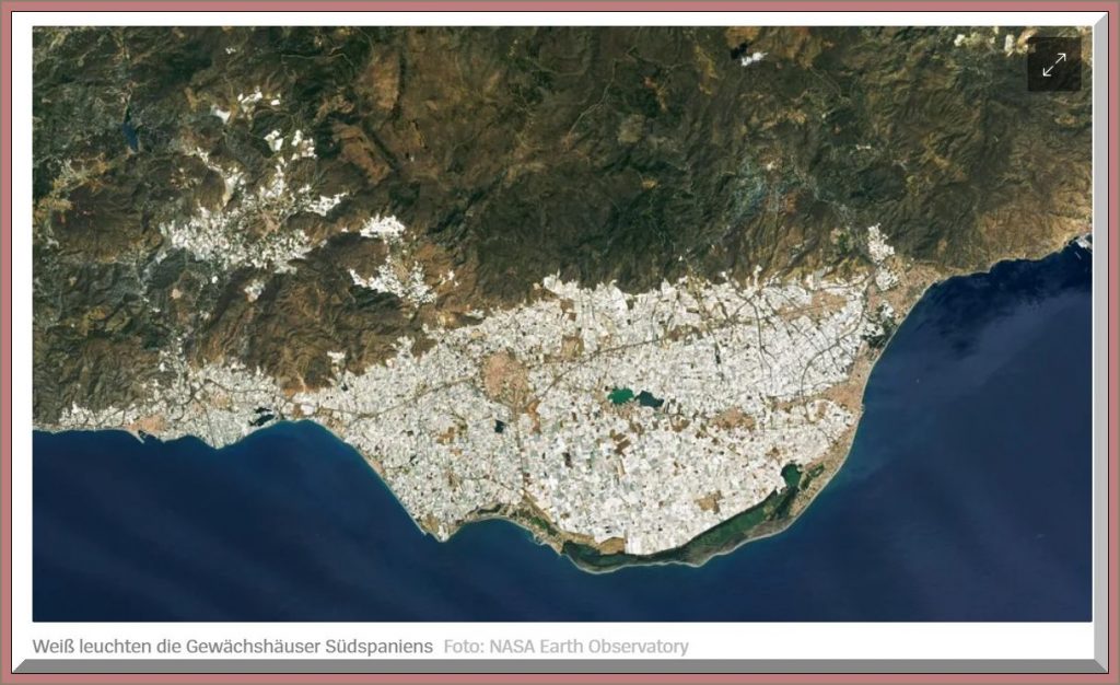 Der Verkauf von Gemüse und Obst aus Gewächshäusern in Südspanien ist ein Milliardengeschäft. Für die Umwelt fällt die Bilanz eher gemischt aus. Ein Satellitenbild zeigt, wie riesig die Anbaufläche inzwischen ist. Trocken ist es in Almería und Umgebung, sehr trocken. Nur rund 200 Liter Regen pro Quadratmeter fallen durchschnittlich pro Jahr in Andalusien. Zum Vergleich: In Hamburg sind es fast 800, in München sogar mehr als 900. Doch trotz des knappen Wassers wachsen in der südspanischen Sonne jedes Jahr riesige Mengen Gemüse und Obst: Paprika, Tomaten, Auberginen, Gurken und Melonen zum Beispiel. Zuletzt legte auch der Hanfanbau  stark zu. Insgesamt stehen in der Region auf rund 320 Quadratkilometern Gewächshäuser. Versorgt werden die Pflanzen meist über Tröpfchenbewässerung, gespeist aus lokalen Grundwasserleitern – zumindest so lange diese noch genügend Wasser führen.