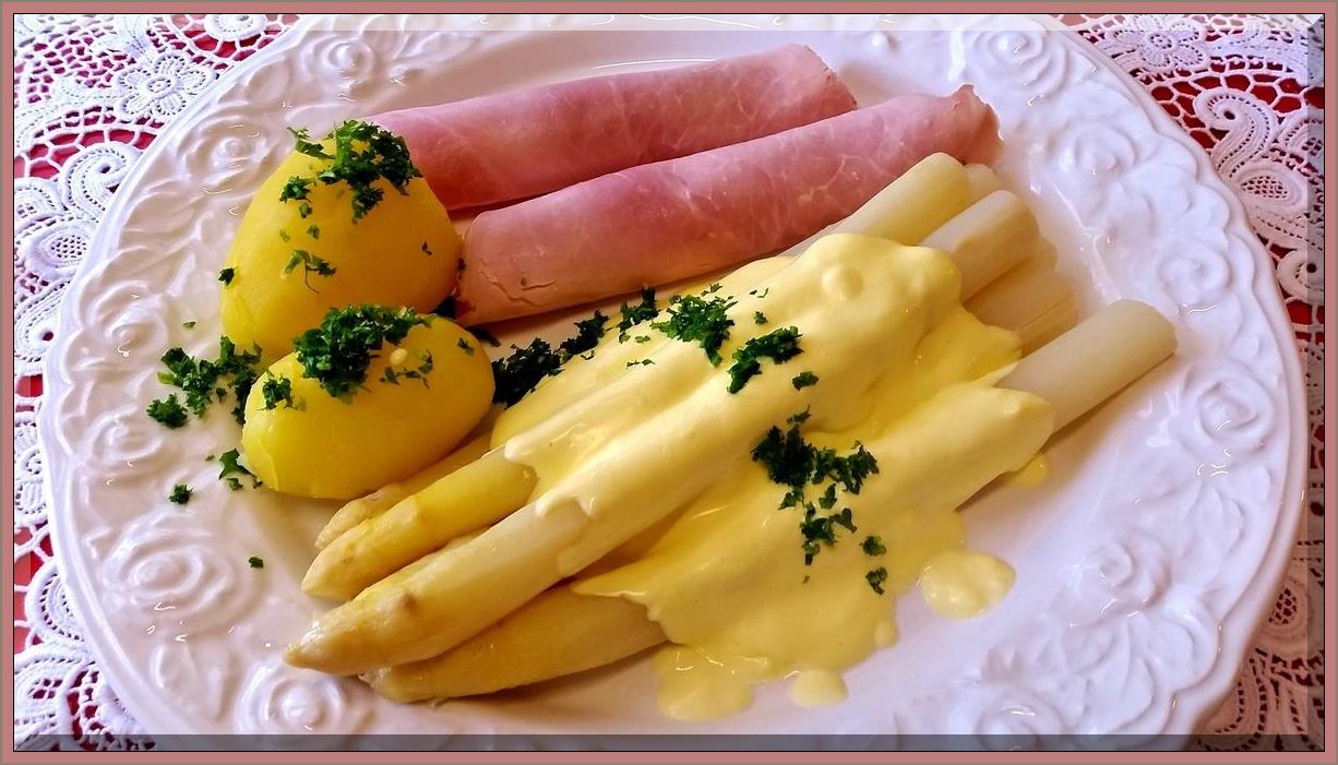 17:30 Uhr – Abendessen: Erster Deutscher Spargel in dieser Saison. Den Schinken wechseln wir oft: Schwarzwälder-, Serano-, Koch- u. Parmaschinken