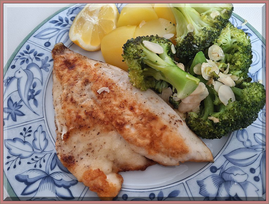 17:30 Uhr – Abendessen: Doradefilet, Brokkoli mit Butter-Mandel-Blättchen und Salzkartoffeln: