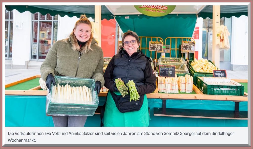 Sindelfingen. Seit Ostern wird sowohl grüner als auch weißer Spargel aus Deutschland in unterschiedlichen Qualitäten auf dem Markt angeboten. Wie in den Jahren zuvor ist auch Udo Somnitz mit seinem Spargelangebot auf dem Sindelfinger Wochenmarkt anzutreffen 19,90 €/Kg. „Wir freuen uns, dass die Saison wieder startet und wir sowohl unsere Stammkunden als auch neue Kunden antreffen“, sagt der Spargelhändler aus dem badischen Kraichtal.