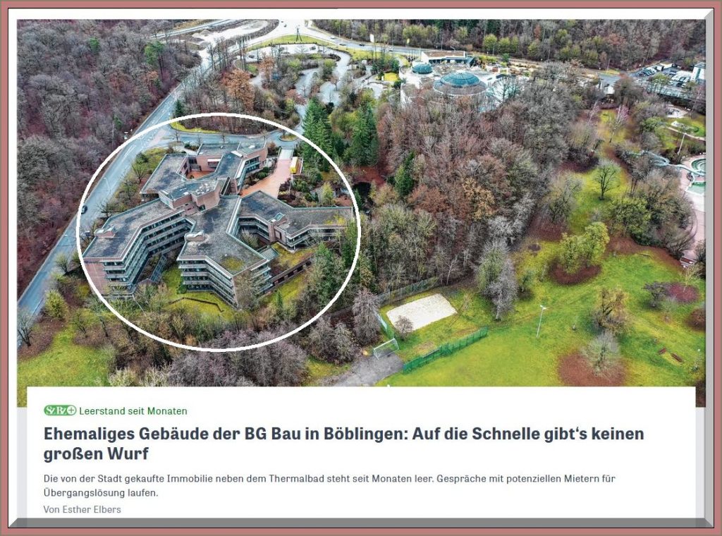 Die Zugänge sind mit Gittern versperrt, zwischen den Bodenplatten wächst Unkraut. Der ehemalige Bürokomplex der Berufsgenossenschaft der Bauwirtschaft (BG Bau) an der Friedrich-Gerstlacher-Straße in Böblingen steht seit Monaten leer. Die Stadt hat das Gebäude Ende 2022 gekauft und im Frühjahr 2023 von der Berufsgenossenschaft übernommen. Die Frage ist: Warum tut sich auf dem Areal neben dem Thermalbad bislang nichts?