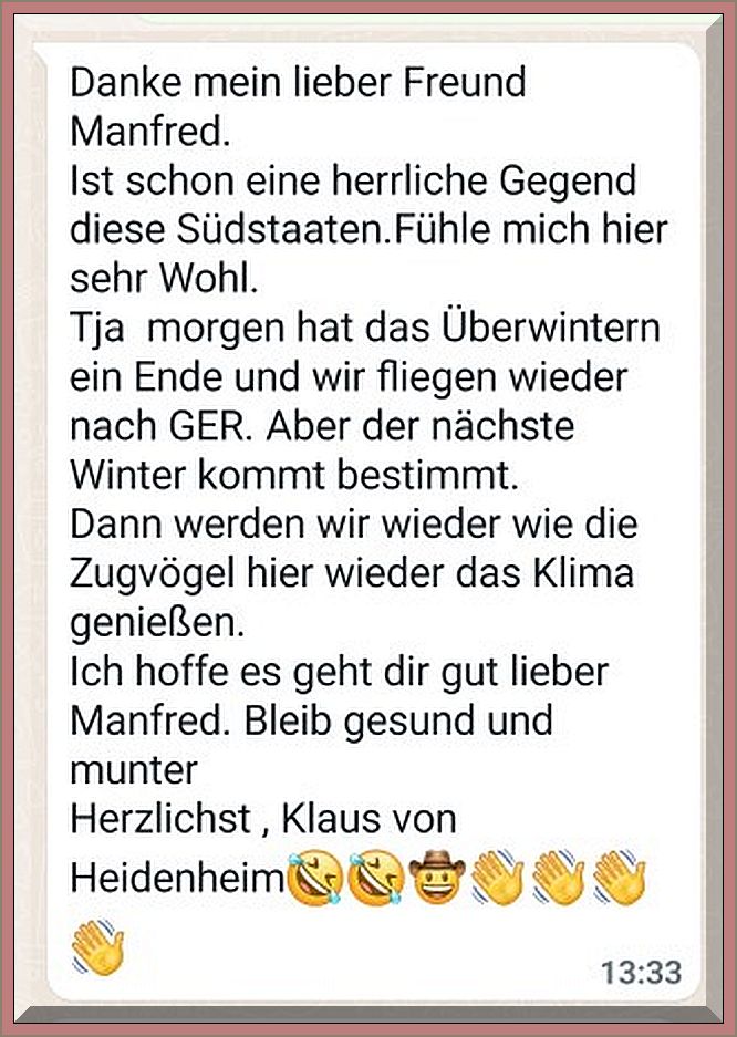 Es folgt eine Bilderreigen von meinem früheren Bodensee-Segelkameraden „Graf“ Klaus von Heidenheim, derzeit in den Südstaaten der USA – dort ist er häufiger und es scheint seine Wahlheimat geworden zu sein – danke Klaus, nette Bilder.