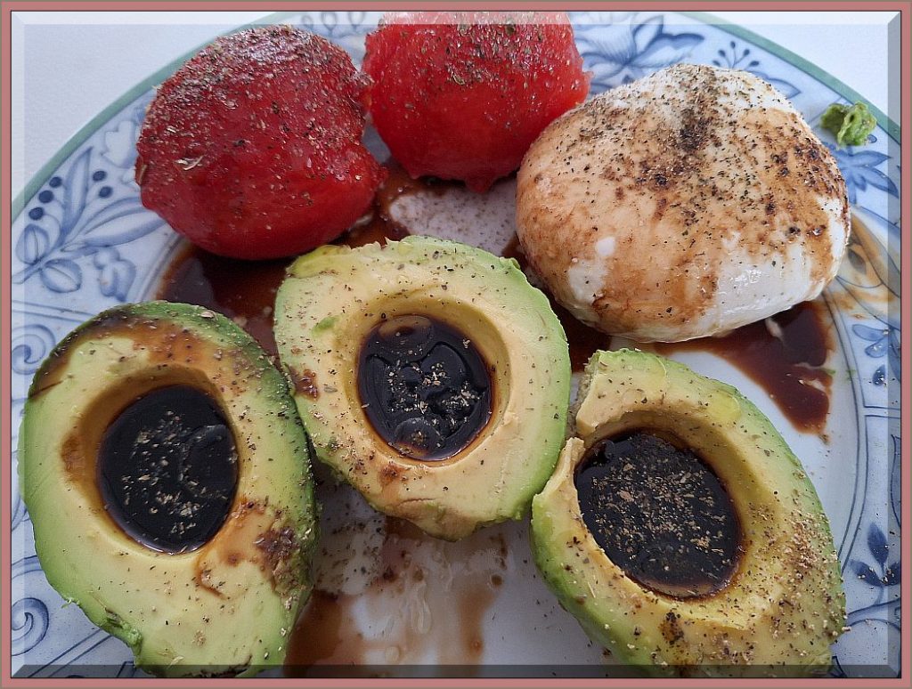 17:15 Uhr – Abendessen steht schon fest: Avocado, Mozzarella, gehäutete Tomaten, Pfeffer, Mozzarella Salz u. roten Balsamico, Giabatta-Brot: