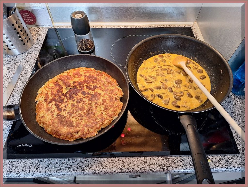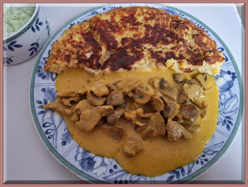 17:30 Uhr – Ein herrliches Abendessen: Rösti von gekochten Kartoffeln, Schweinefilet-Geschnetzeltes mt Rahm-Champignons in Safransauce und Salat von der grünen Gurke: