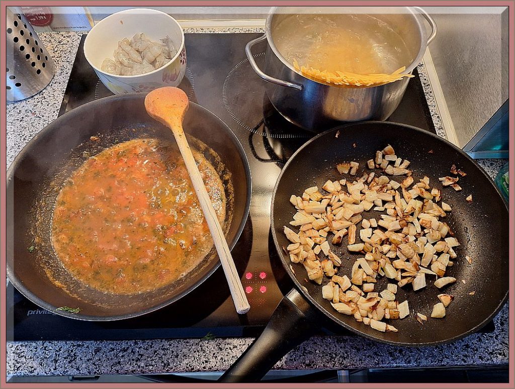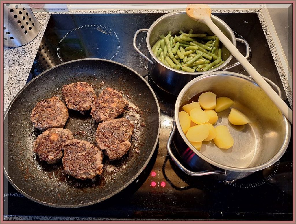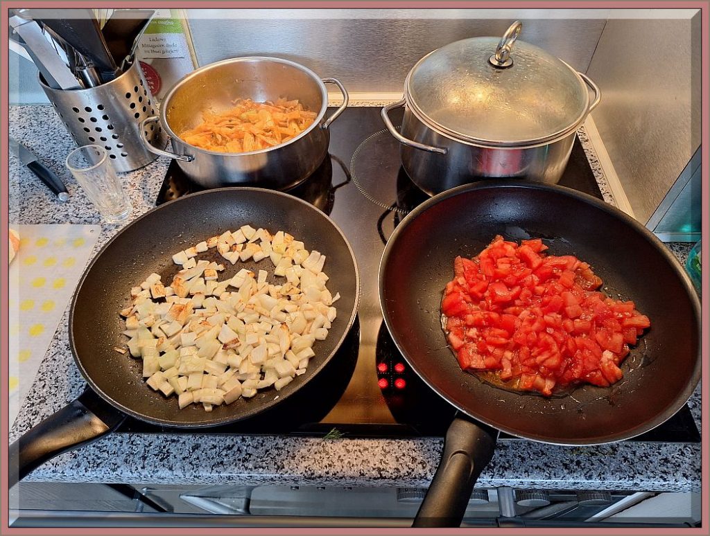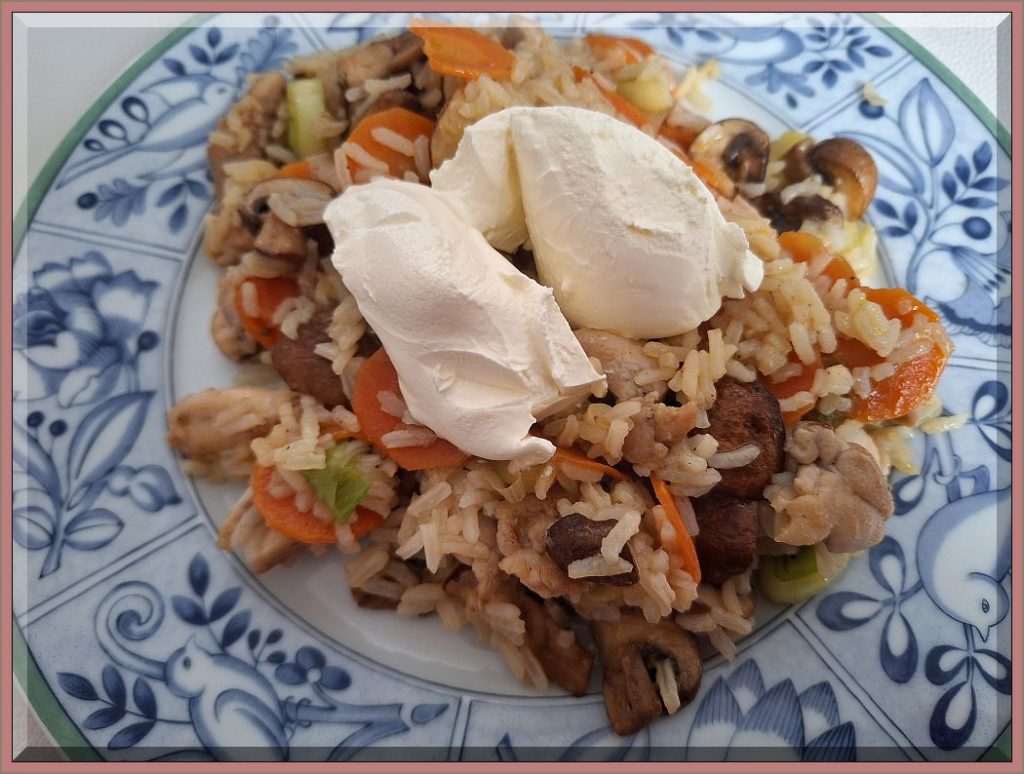 16:45 Uhr – Abendessen zubereiten: Champignons, Karotten, Lauch, Knoblauch, geschnetzelte Hühneroberschenkel, alles gebraten – dazu Jasminreis, der zum Schluss auch noch kurz mitgebraten wurde. Salz, Pfeffer, Paprika nach Geschmack.