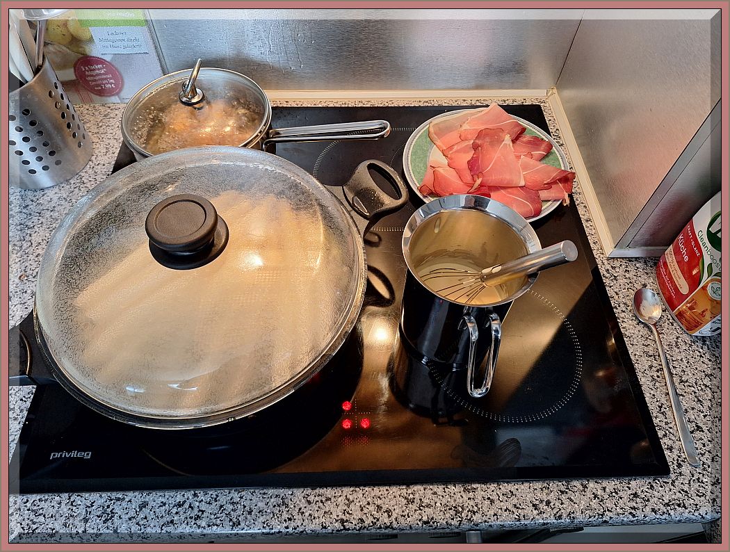 17:30 Uhr – Abendessen: Spargel, Sauce Hollandaise u. Pellkartoffeln