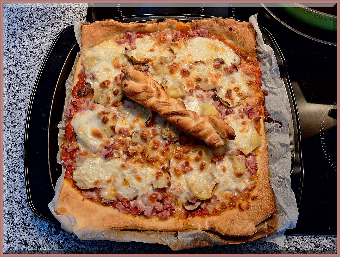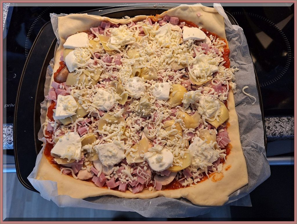 reduzierte frische Tomatensoße aus 6 gehäuteten Tomaten mit Salz, Pfeffer, Paprika, Knoblauch u. Oregano zubereitet, Champignonscheiben, Oliven, Würfel vom gek. Schinken, Artischockenblätter, Mozzarellakäse, Pizzakäse – soweit das Originalrezept. Wer will kann noch Kapern und Sardellen auflegen.