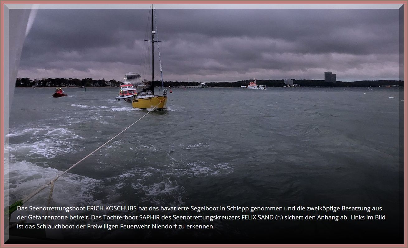 Auf diese Weise gelang es der ERICH KOSCHUBS, die Crew des Segelbootes aus ihrer lebensgefährlichen Lage zu befreien. Das Seenotrettungsboot schleppte den Havaristen aus der Brandungszone. Allerdings lag das Ruder hart Backbord und ließ sich nicht mehr bedienen. Das Tochterboot SAPHIR der FELIX SAND sicherte deshalb den Anhang als Heckschlepper.