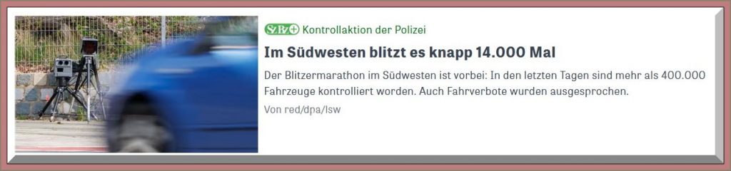 Beim Blitzermarathon im Südwesten sind am Freitag 13 659 Fahrzeuge geblitzt worden – 430 mehr als im Vorjahr. Das teilte das Innenministerium am Samstag mit. Landesweit gab es demnach 425 Kontrollstellen. Knapp 1000 Polizistinnen und Polizisten sowie Beschäftigte der Kommunen waren an dem Tag im Einsatz. Mehr als 400 000 Fahrzeuge wurden kontrolliert. 113 Fahrverbote wurden ausgesprochen.