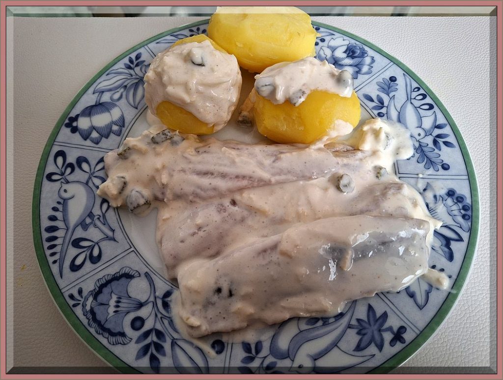 17:30 Uhr – Abendessen: Räuchermatjes mit weißer Soße inkl. kleinsten Apfel- u. Gurkenstückchen und Pellkartoffeln: