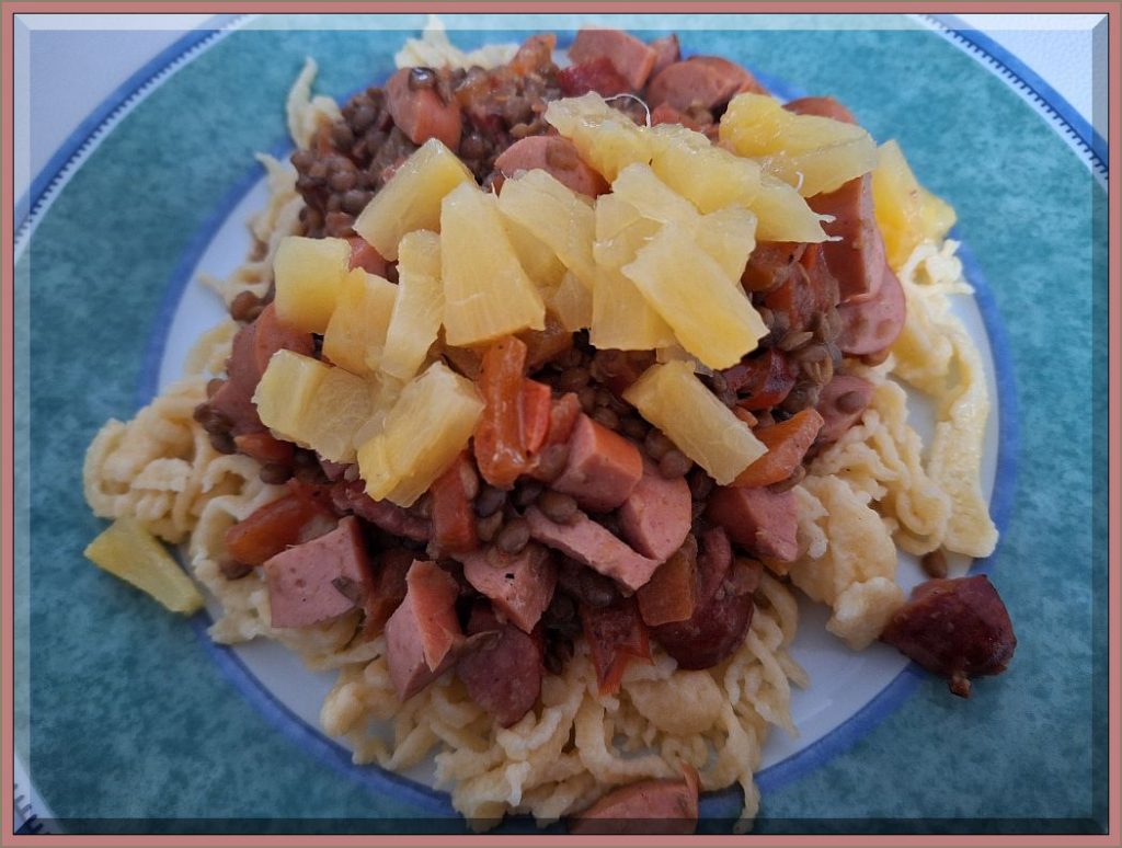 17:30 Uhr – Abendessen: Linsen von HAK mit selber gemachten Spätzles und 2 Wienerle + 1 Krakauer in Scheiben, 1 geschälte Paprika in Würfeln, Ananasstückchen aus der Dose, weißer Balsamico. Peffer, Paprika, ein Schuß Sahne: