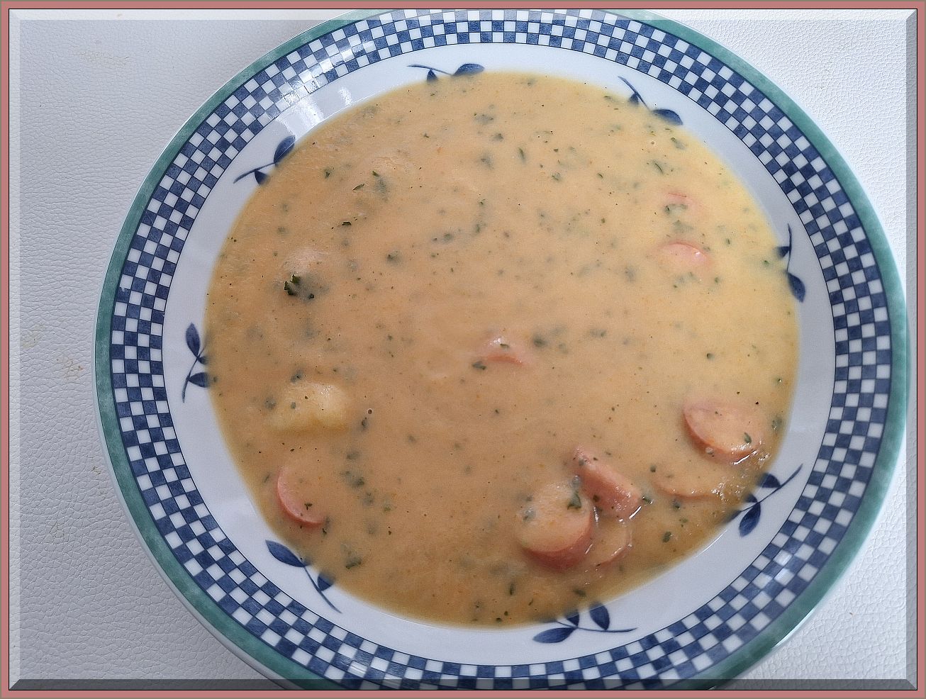 17:30 Uhr – Es gab eine Gemüsebrühe/Kartoffelsuppe mit 1 Kohlrabi, 2 Möhren, 1/2 Becher Crème Fraîche, Petersilie, Salz, Pfeffer, Paprika und 1 Prise Chili, alles fein püriert und pro Person 1 Wienerle in Scheiben: