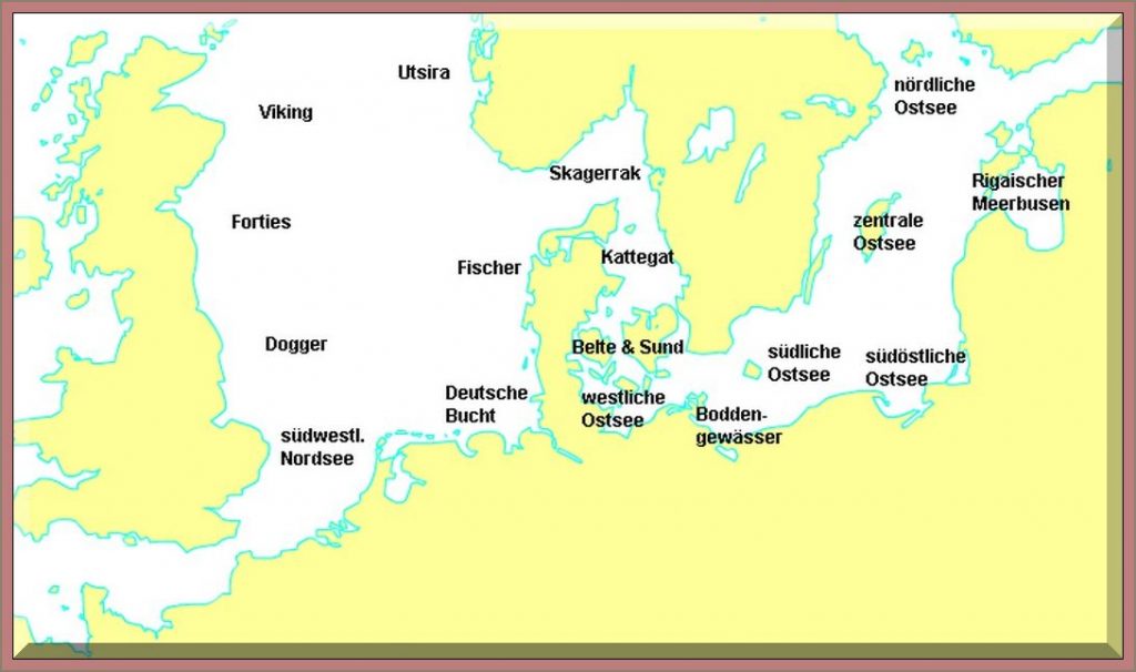 Deutsche Bucht: Südost um 4, südwestdrehend, Westteil vorübergehend zunehmend 6 bis 7, strichweise Gewitterböen, zeitweise diesig, See zunehmend 3 Meter. IJsselmeer: Südost um 4, südwestdrehend, vorübergehend zunehmend 5 bis 6, vorübergehend Gewitterböen, zeitweise diesig, See 0,5 Meter. Südwestliche Nordsee: Östliche Winde um 4, süd- bis südwestdrehend, vorübergehend zunehmend 6, Themse vorübergehend 7 bis 8, strichweise Gewitterböen, zeitweise diesig, See zunehmend 2,5 Meter. Engl.Kanal-Ost: Wechselnde Richtungen 5 bis 7, südwestdrehend um 4, Gewitterböen, See 2 Meter. Engl.Kanal-West: Nord um 5, südwestdrehend, Gewitterböen, See 1,5 Meter. Dogger: Anfangs Ost um 4, vorübergehend wechselnde Richtungen 5 bis 7, später Süd um 5, strichweise Gewitterböen, vorübergehend starker Regen, See zunehmend 2,5 Meter. Fischer: Ost um 5, Nordteil vorübergehend zunehmend 6 bis 7, süd- bis südwestdrehend, strichweise Gewitterböen, zeitweise diesig, See 1 bis 3 Meter. Forties: Östliche Winde 4 bis 5, vorübergehend wechselnde Richtungen 5 bis 7, später Süd um 5, zeitweise starker Regen, See 1 bis 3 Meter. Utsira: Nordteil schwachwindig, vorübergehend Ost 4 bis 5, Südteil Ost bis Südost um 5, zunehmend 6 bis 7, süddrehend, später diesig, See zunehmend 3 Meter. Viking: Östliche Winde um 3, süd- bis südwestdrehend und zunehmend 7 bis 8, zeitweise starker Regen, See zunehmend 3 Meter.