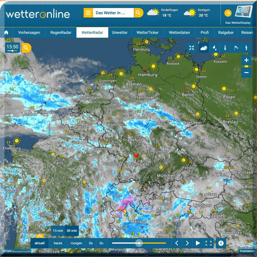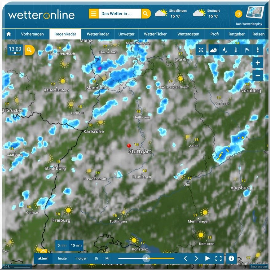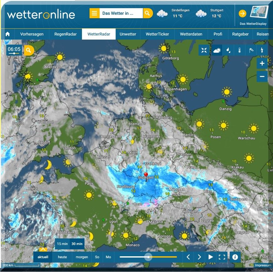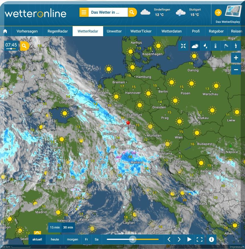 Ich erwarte heute für Sindelfingen, daß die Sonne wieder zum Vorschein kommen wird.