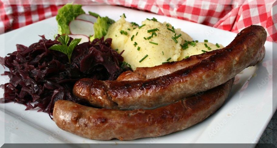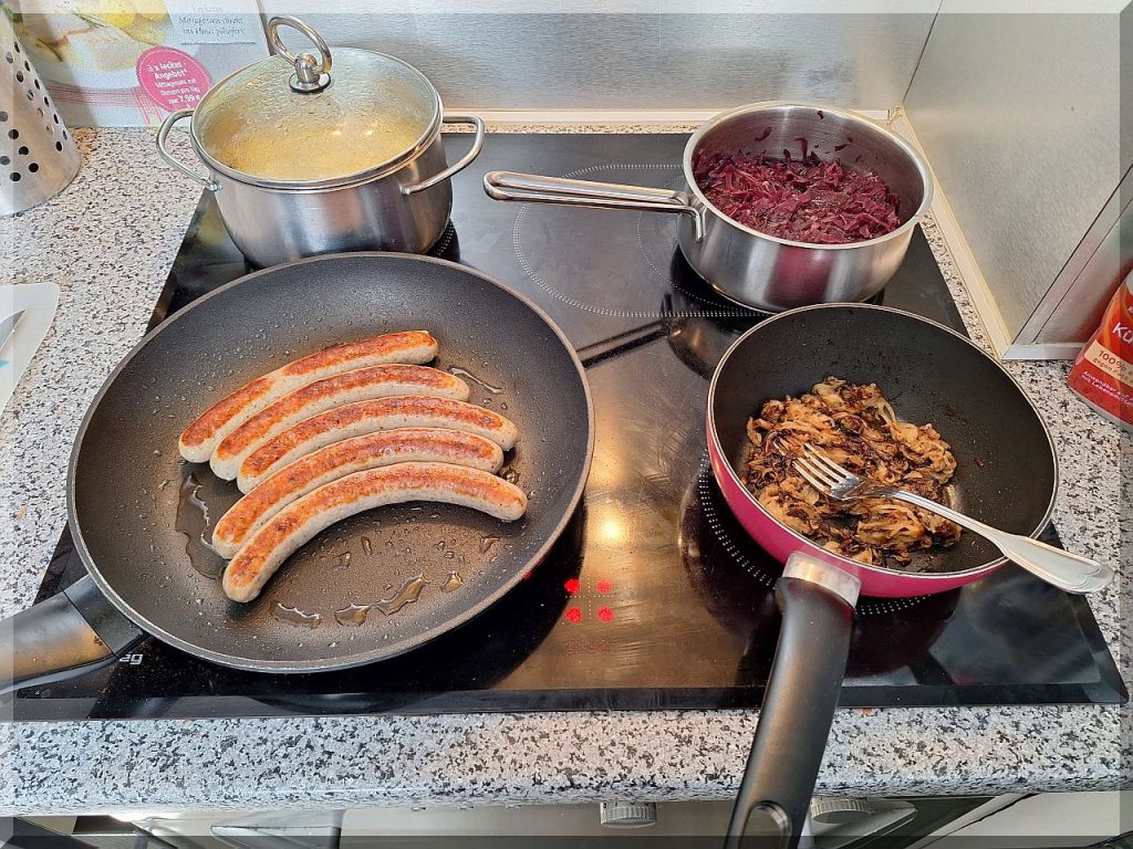 17:30 Uhr – Zum Abendessen gibt es Fränkische Rostbratwürste mit Röstzwiebeln, Rotkraut und Kartoffelpüree: